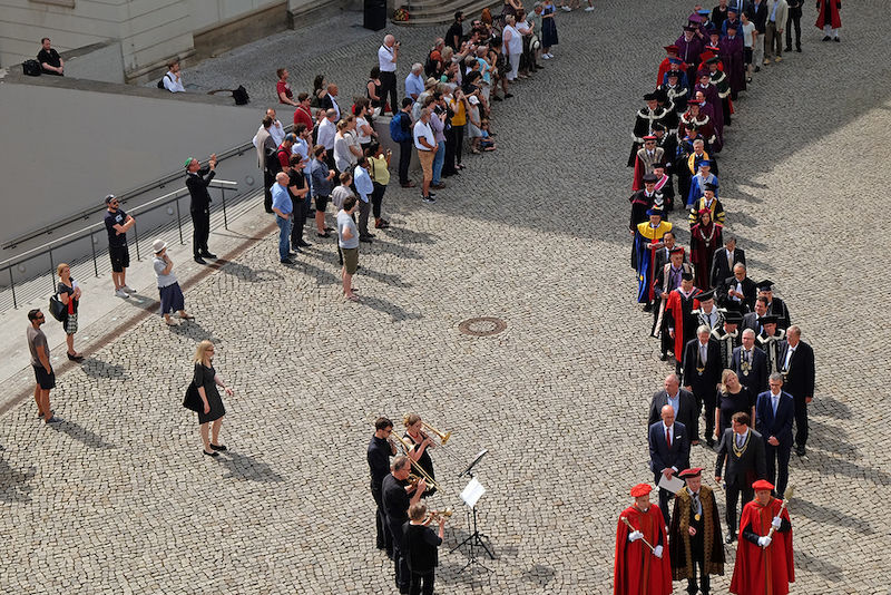 Der Festakt endete mit dem feierlichen Auszug des akademischen Festzugs, der sich vom Löwengebäude zurück zum Rektoratsgebäude bewegte.