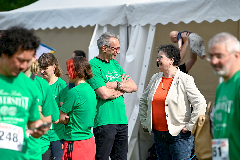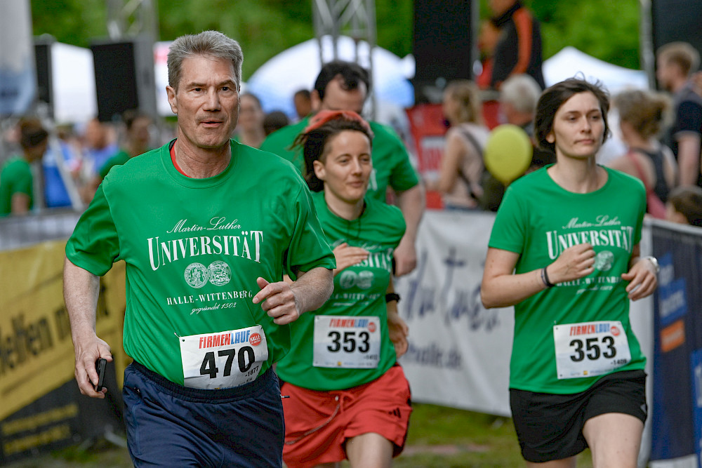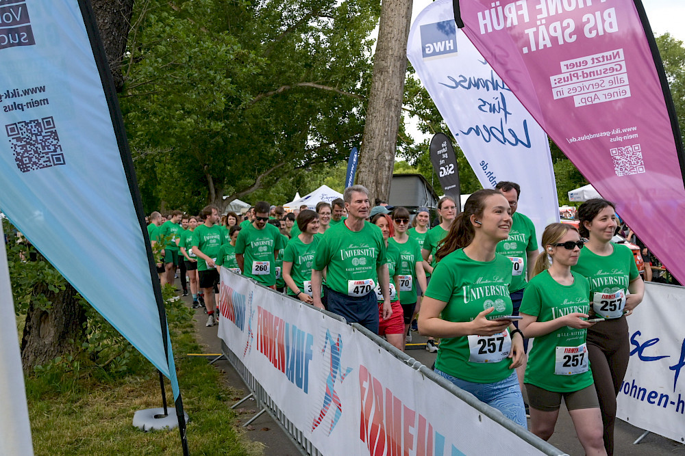 Mit 36 Teams ist die MLU in diesem Jahr zum ersten Mal beim Firmenlauf Halle an den Start gegangen. Damit erreichte die Universität bei ihrem Debüt Platz zwei in der Wertung für die meisten Teilnehmerinnen und Teilnehmer. Für die MLU absolvierten 144 Läuferinnen und Läufer die 2,5-Kilometer-Strecke, die meisten davon in grünen Uni-Shirts.