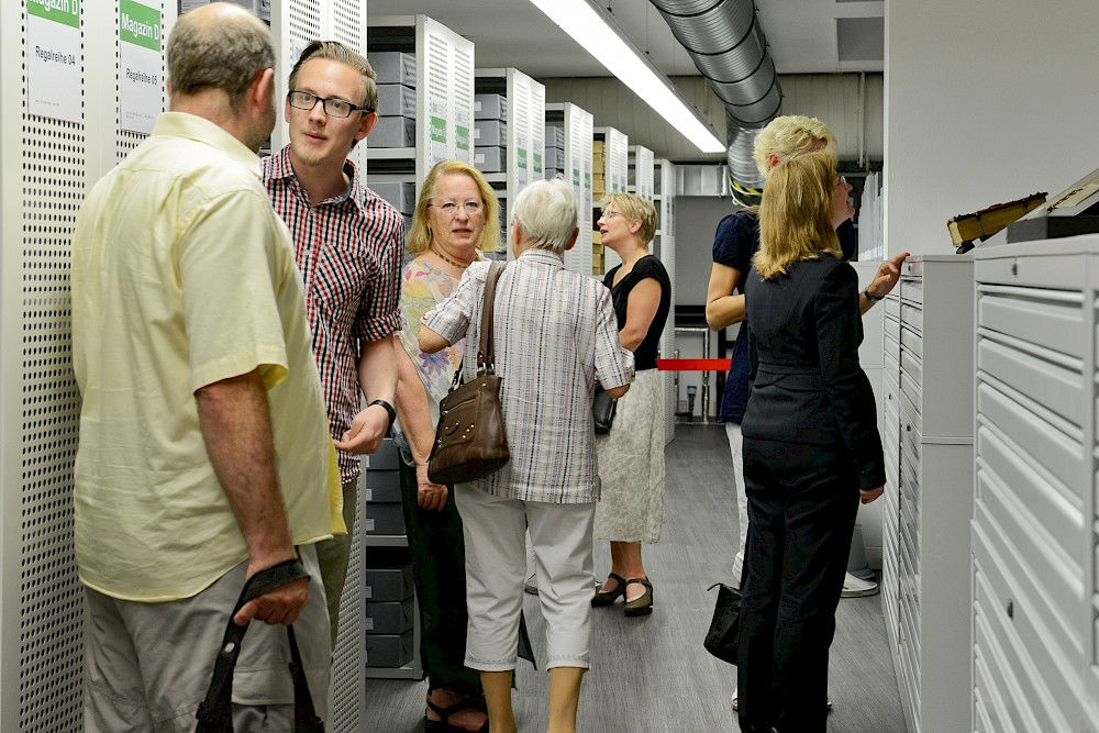 Ein rotes Absperrband aus dem alten Archiv in der Pfännerhöhe, das mit dem Aufdruck „Kein Durchgang“ versehen war, wurde schließlich Symbol für den Neuanfang am neuen Ort. Stahlknecht, Sträter und Ruprecht durchschnitten es gemeinsam, bevor sie mit Sekt auf die Zukunft des Archivs anstießen. Zukunft hat es am neuen Ort in der Tat: Auf 1.800 Quadratmetern finden insgesamt sechs Kilometer Archivgut Platz, erst vier davon sind gefüllt.