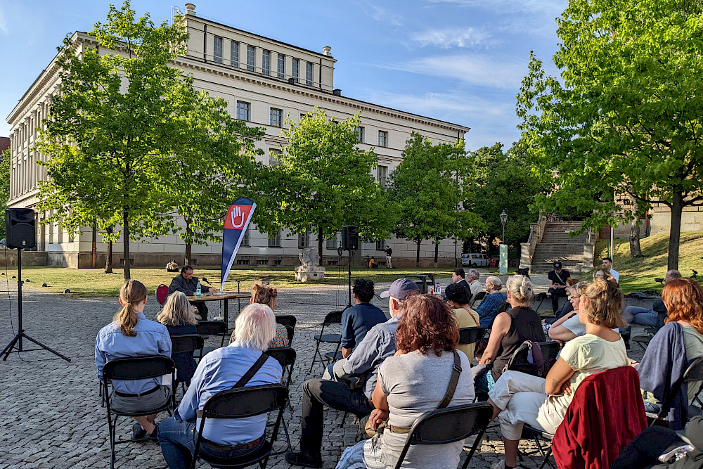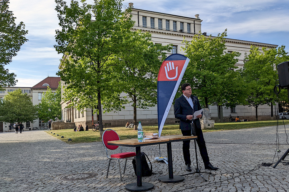 Im Anschluss las der hallesche Schriftsteller, Literaturkritiker und Alumnus der MLU André Schinkel aus Büchern verfolgter Autorinnen und Autoren.