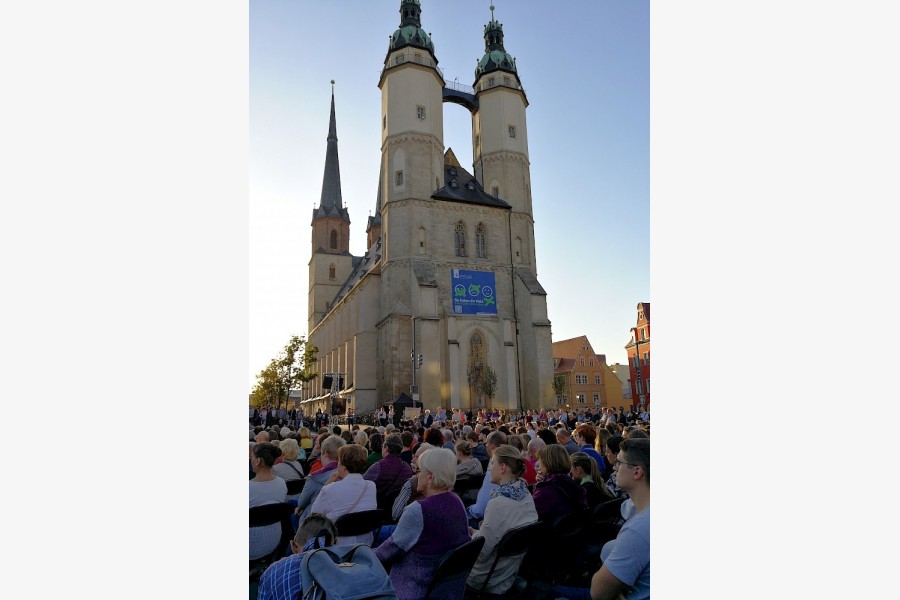 Eigentlich hätte an diesem Abend der Semestereröffnungsgottesdienst der Universität gehalten werden sollen – wie in jedem Semester am ersten Montag in der Vorlesungszeit. Nach dem Anschlag auf die hallesche Synagoge und dem Tod zweier Menschen luden die Evangelische Kirche in Mitteldeutschland (EKM), das Bistum Magdeburg, die Evangelische Landeskirche Anhalts, die Arbeitsgemeinschaft Christlicher Kirchen in Halle sowie die Martin-Luther-Universität und der Friedensgebetskreis gemeinsam zu einem Gottesdienst an diesem Abend ein.