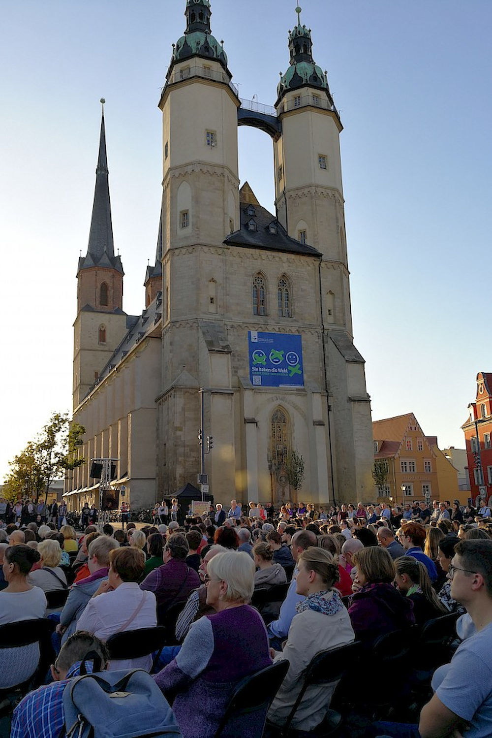 Es kamen Hunderte Menschen in die Marktkirche, Hunderte versammelten sich auf dem Marktplatz und verfolgten die Liveübertragung aus der Kirche. Auch der Vorsitzende der Jüdischen Gemeinde in Halle Max Privorotzki nahm teil. Die Predigt hielt der Landesbischof der EKM Friedrich Kramer. Es waren neben dem Ministerpräsidenten des Landes Sachsen-Anhalt Dr. Reiner Haseloff zahlreiche Kabinettsmitglieder anwesend sowie viele Bundestags- und Landtagsabgeordnete. Fürbitten sprachen auch Prof. Dr. Christian Tietje, der Dekan der Theologischen Fakultät Prof. Dr. Daniel Cyranka und Universitätsprediger Prof. Dr. Jörg Ulrich.