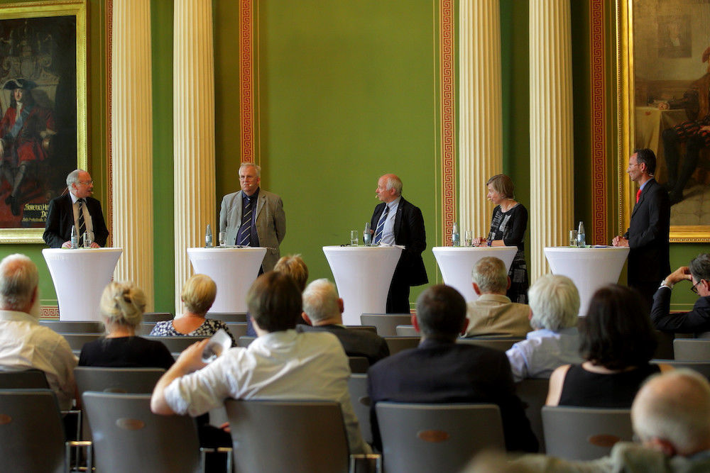 Am frühen Nachmittag schloss sich der Dialog der Fakultäten unter dem Titel „Vier Fakultäten – zwei Standorte – eine neue Universität“ an. Vier Vertreter der klassischen Fakultäten blickten auf die Veränderungen die Wittenberg für die neue Vereinigte Friedrichs-Universität brachten. Moderiert wurde der Dialog von Altgermanist Prof. Dr. Hans-Joachim Solms.