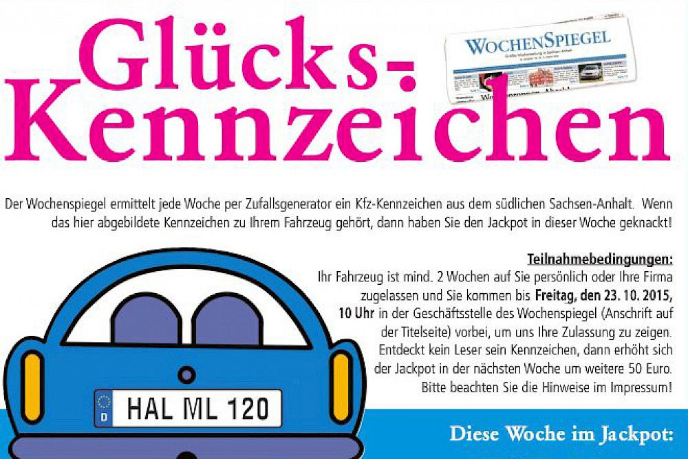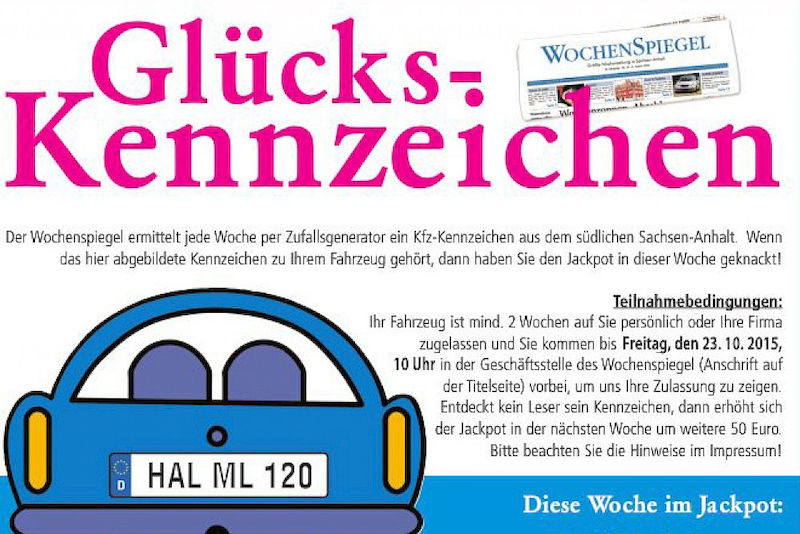Der Wochenspiegel ermittelt jede Woche per Zufallsgenerator ein Autokennzeichen aus dem südlichen Sachsen-Anhalt und verlost an den Fahrzeughalter einen kleinen Jackpot. Einzige Voraussetzung: Der Gewinner muss innerhalb von zwei Tagen mit der Fahrzeugzulassung zur Geschäftsstelle des Wochenspiegels kommen.