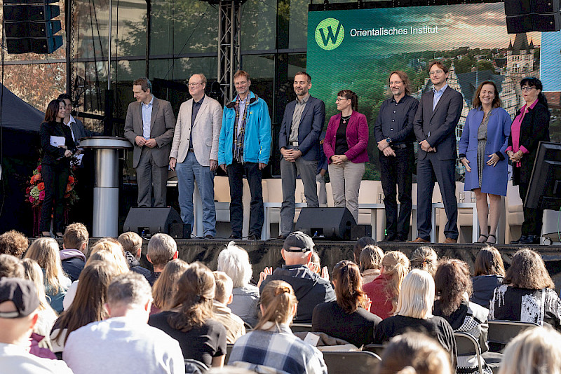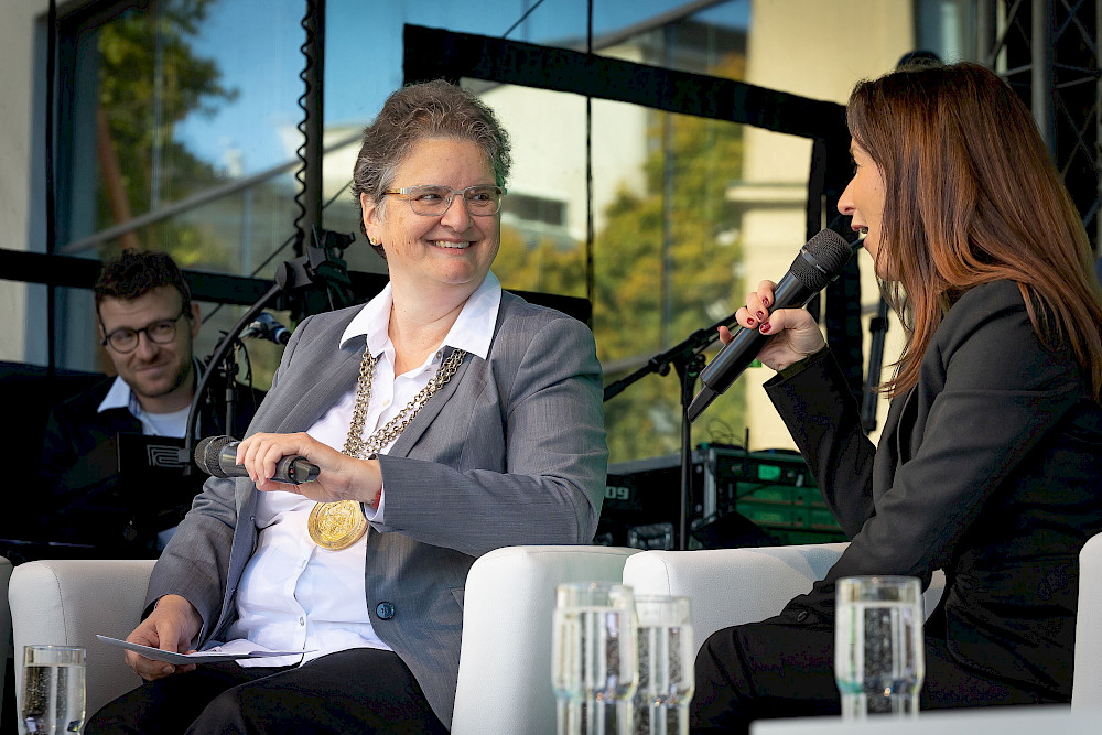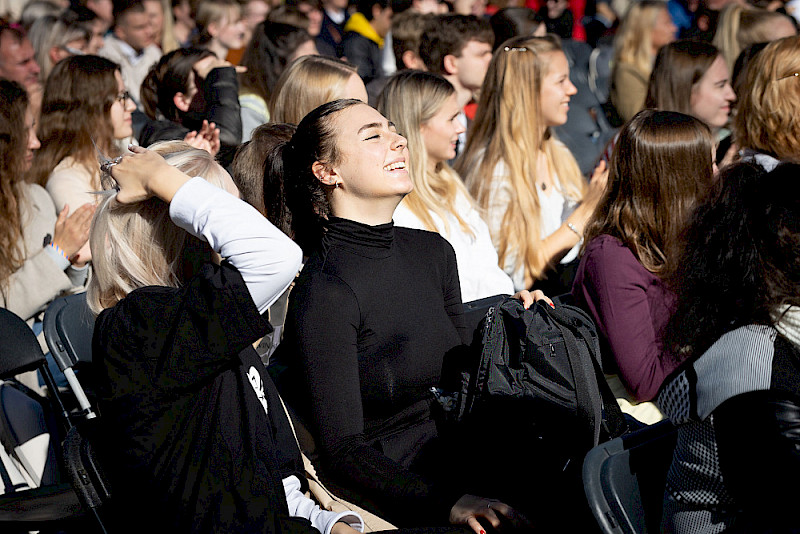 Es folgte der erste Auftritt Claudia Beckers mit Amtskette auf der großen Bühne beim Ersti-Talk. Auch dort hatte sie den einen oder anderen guten Tipp für die Studierenden parat. Ein Studium, das bedeute Freiheit und Selbstständigkeit, aber auch Eigenverantwortung und Selbstorganisation. Die Frage „Abends zur Party gehen oder/und am nächsten Morgen um 8 Uhr im Hörsaal auflaufen?“ sei real und eigentlich nur mit „und“ zu beantworten, so Becker.