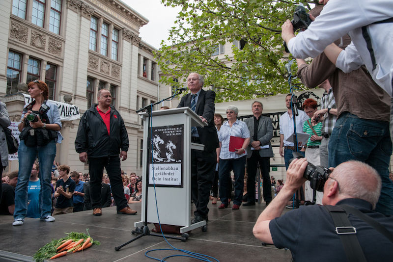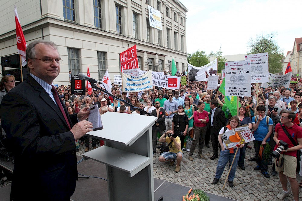 Ministerpräsident Reiner Haseloff sprach am Rednerpult schließlich von Dialogbereitschaft. Er wolle gemeinsam zu politischen Lösungen kommen. Zu diesem Zweck hatte es bereits am Nachmittag ein Gespräch zwischen Vertretern des "Aktionsbündnis MLU - Perspektiven gestalten" gegeben (mehr dazu im Video des MDR). „An der Ressource Bildung sparen wir nicht – Bildung ist ein Gesamtkonzept“, sagte Haseloff auf dem Uniplatz. „Lügner! Lügner!“ schallte es ihm aus dem Publikum entgegen.