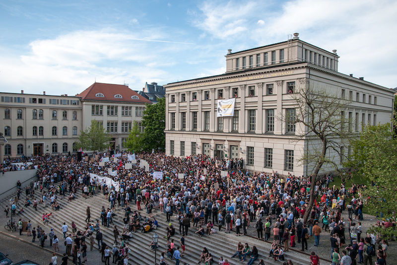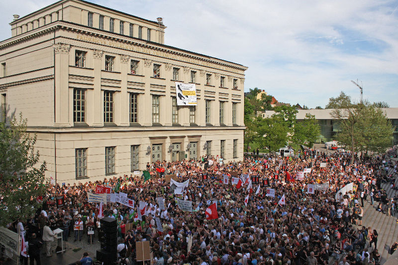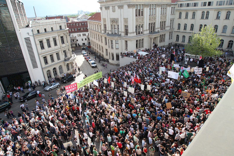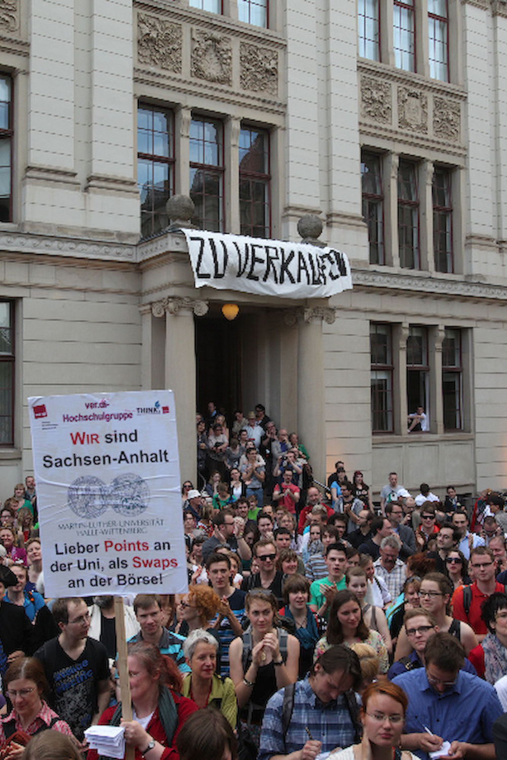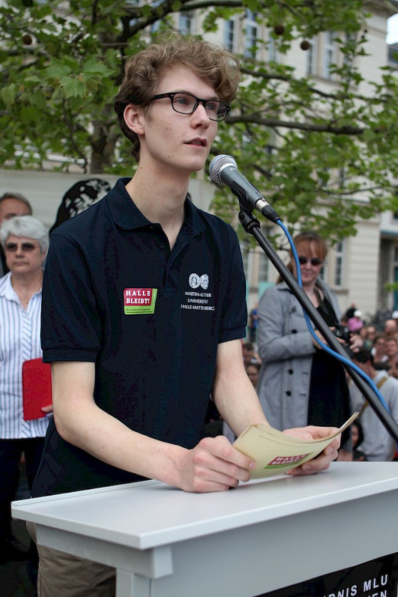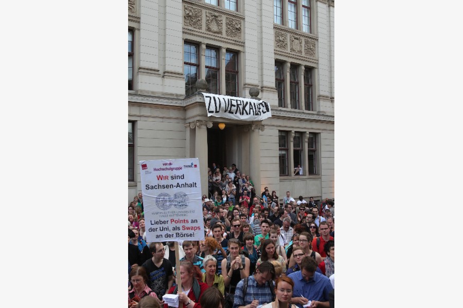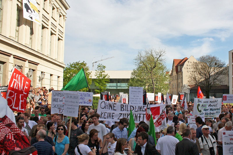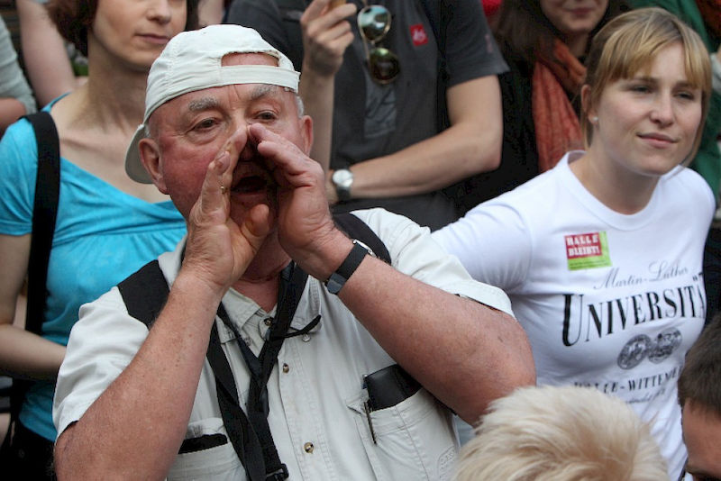 Mehr als 3000 Menschen mit Plakaten, Trillerpfeifen oder Hasenohren hatten sich auf dem Universitätsplatz gegen 17.30 Uhr eingefunden, um vor Haseloff ihren Unmut über die Kürzungspläne der Landesregierung im Hochschul- und Kulturbereich kund zu tun. Nicht nur Uni-Angehörige und Mitglieder des Hochschulbündnis' aus vielen Landesteilen, auch Kulturschaffende waren zahlreich gekommen und hatten sogar Theaterpuppen mitgebracht. Matthias Brenner, Intendant des "neuen theaters" rief alle zu gemeinsamen Protesten auf: "Es ist Zeit, dass wir das Aktionsbündnis zu einer ganz breiten demokratischen Schlagkraft entwickeln. Bildung ist Kultur - Kultur ist Bildung. Wir sind alle gemeint!"
