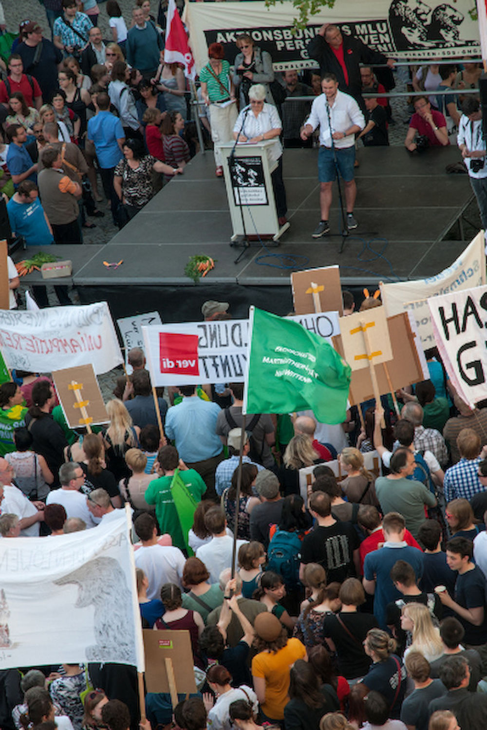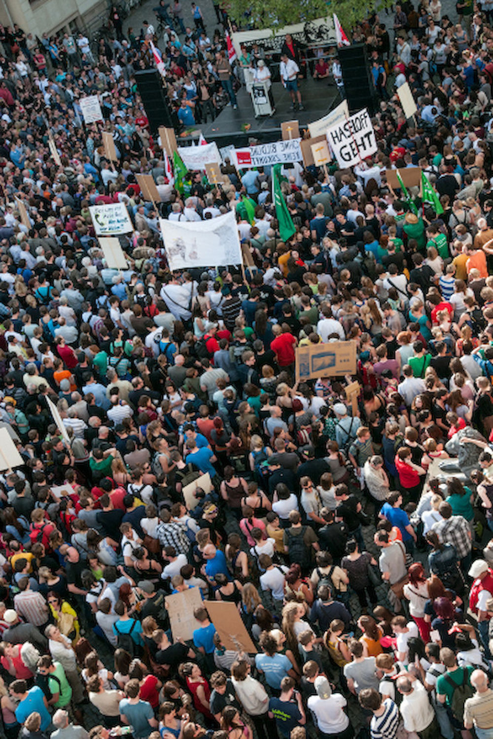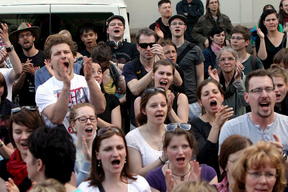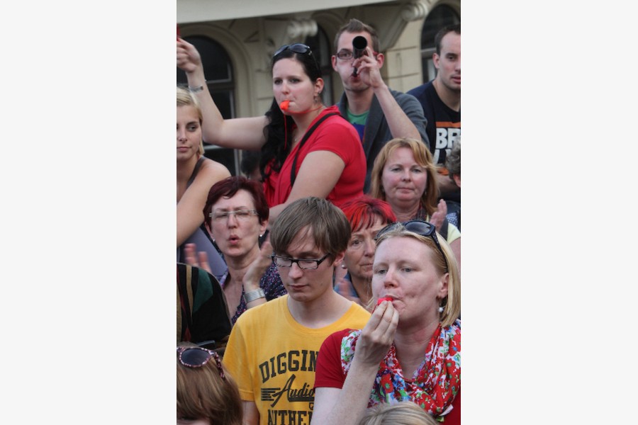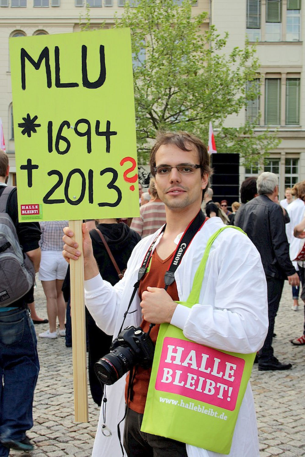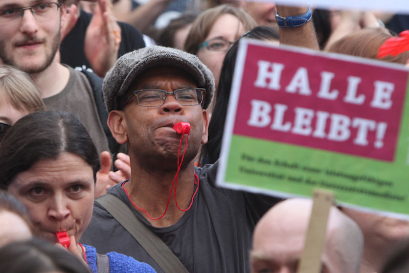 Mehr als 3000 Menschen mit Plakaten, Trillerpfeifen oder Hasenohren hatten sich auf dem Universitätsplatz gegen 17.30 Uhr eingefunden, um vor Haseloff ihren Unmut über die Kürzungspläne der Landesregierung im Hochschul- und Kulturbereich kund zu tun. Nicht nur Uni-Angehörige und Mitglieder des Hochschulbündnis' aus vielen Landesteilen, auch Kulturschaffende waren zahlreich gekommen und hatten sogar Theaterpuppen mitgebracht. Matthias Brenner, Intendant des "neuen theaters" rief alle zu gemeinsamen Protesten auf: "Es ist Zeit, dass wir das Aktionsbündnis zu einer ganz breiten demokratischen Schlagkraft entwickeln. Bildung ist Kultur - Kultur ist Bildung. Wir sind alle gemeint!"