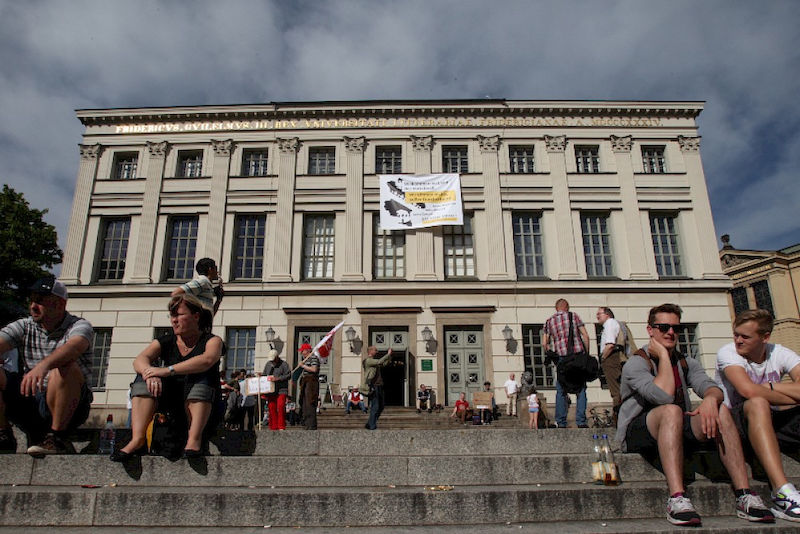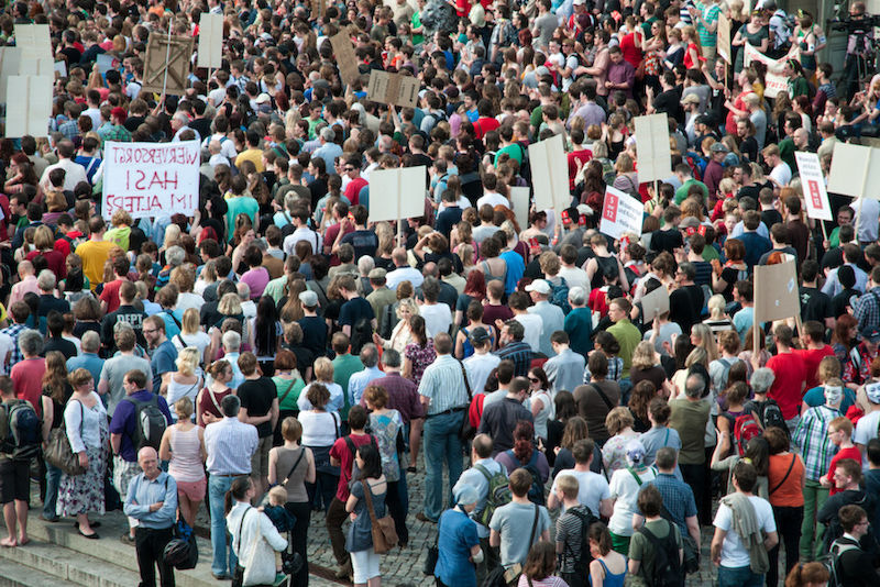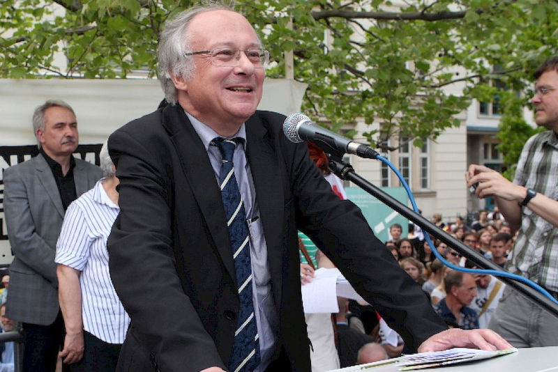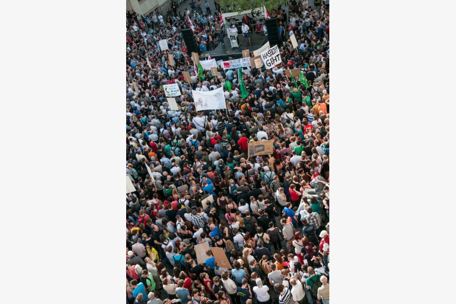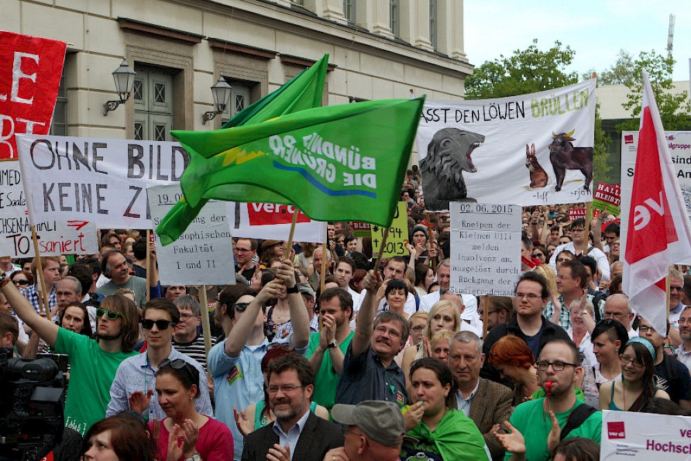 Er verspreche, „dass wir die Haushaltsverantwortung ernst nehmen und unsere Hochschulen trotzdem für die nächsten zwanzig Jahre wettbewerbstauglich machen werden". Die daraufhin immer lauter werdenden Sprechchöre „Wir sind hier! Wir sind laut! Weil man uns die Bildung klaut!“ ließen den Ministerpräsidenten verstummen.