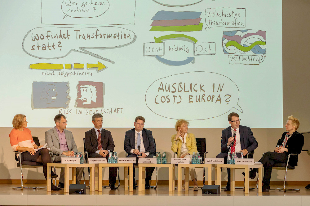 Wie vielfältig und umfassend die wissenschaftliche Expertise vor Ort zu diesem großen Thema ist, unterstrich auch die Podiumsdiskussion mit Prof. Dr. Jonathan Everts, Prof. Dr. Thomas Herzfeld, Prof. Dr. Oliver Holtemöller, Prof. Dr. Marie-Claire Foblets, Prof. Dr. Winfried Kluth und Prof. Dr. Asta Vonderau. Nicht nur forschen sie aus wirtschaftswissenschaftlicher, juristischer, ethnologischer oder geographischer Perspektive zur Transformation. Alle sind auch als Professorinnen und Professoren an der MLU tätig.
