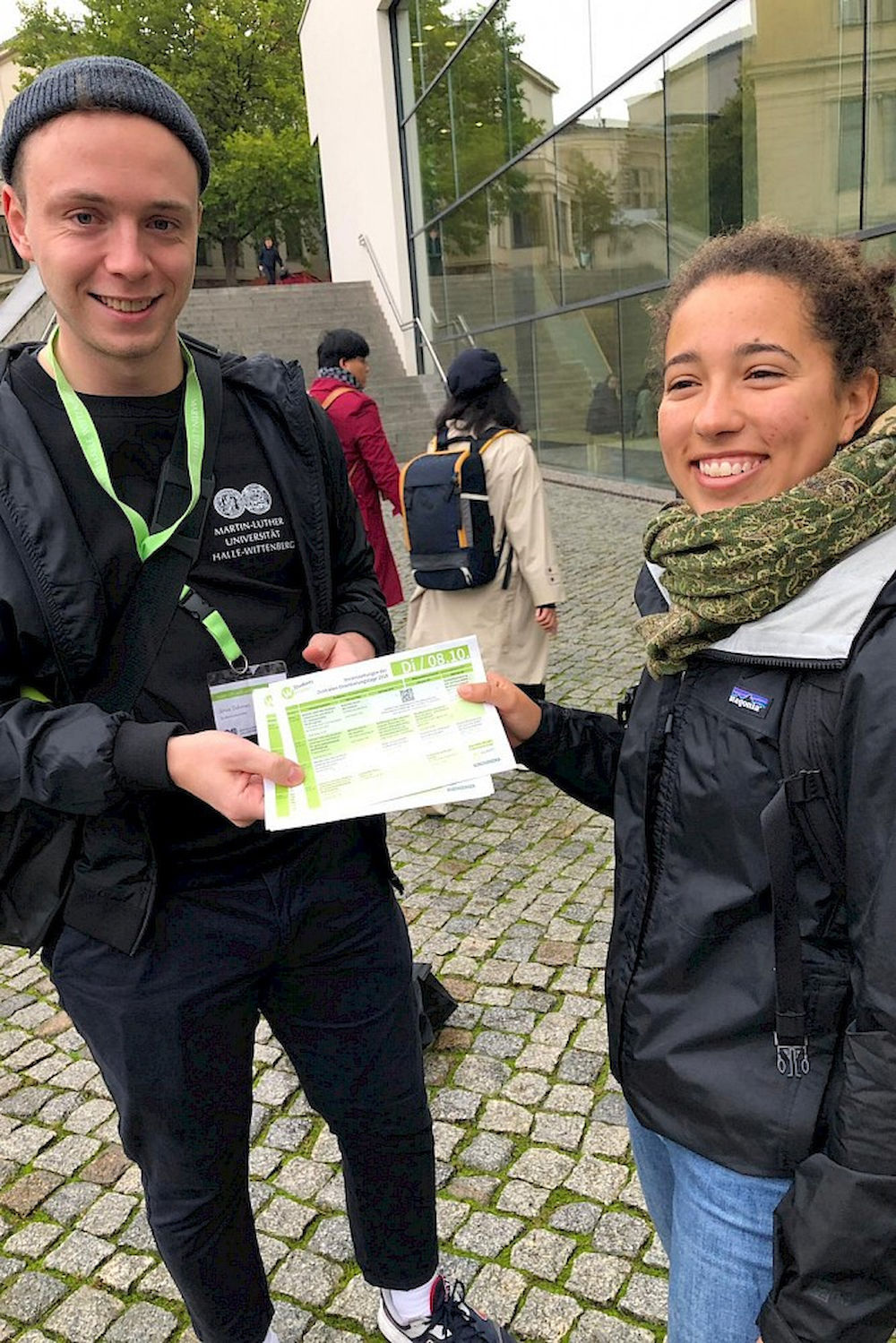 Jonas Dahmen steht im Nieselregen. Mit Handzetteln. Auf dem Universitätsplatz. Er lacht, obwohl der Himmel weint. So ist das eben manchmal Anfang Oktober. Seine „Laufkundschaft“ heute sind die Erstsemester der Uni Halle. Jonas und einige andere Studienbotschafter nehmen ihre neuen Kommilitonen am Campus im Empfang, weisen ihnen den Weg zu den Auftaktveranstaltungen der Zentralen Orientierungstage. In fünf Minuten geht es los – drei Tage lang. Lucia Seidel (20) und Nikola Rimkus-Ebeling (19) sind wenig später frisch versorgt mit dem Tagesprogramm. Lucia kommt aus Dresden, Nikola aus Bamberg. In Halle sind sie zusammen in eine WG gezogen. Weitere Gemeinsamkeit: Beide studieren Ethnologie – und jeweils noch ein weiteres Fach.