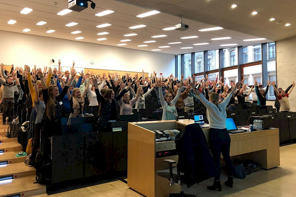 Motivationscoach Isabell Drescher steht in Hörsaal XXII im Audimax. „Ich möchte mit einer Übung starten!“, sagt sie. Na, das geht ja gut los… Arme hoch, strecken, Körperspannung aufbauen, 90 Sekunden durchhalten. Alle machen mit, Drescher ist zufrieden mit dem Start ihres von der Techniker Krankenkasse (TK) organisierten Vortrags „Motiviert durch das Studium“. Die Übung sei zwar nichts für die Öffentlichkeit – „Sieht total bescheuert aus!“ –, aber hervorragend geeignet zum Stressabbau vor delikaten Angelegenheiten wie Vorträgen, Klausuren oder sogar dem ersten Date.