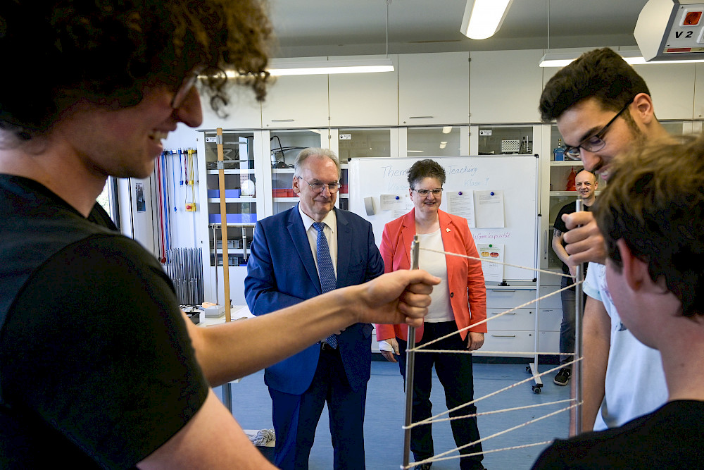 Wo die Förderung der Begeisterungsfähigkeit schon für Schülerinnen und Schüler anfängt, konnte sich der Ministerpräsident während seines Aufenthalts im Hohen Weg 8 auch im Schülerlabor in der Physik-Didaktik anschauen. Er sprach dabei mit Schülerinnen und Schülern des halleschen Georg-Cantor-Gymnasiums – einem Prime-Gymnasium der MLU –, die sich an diesem Tag dort angeleitet von Physik-Didaktikern mit Klimaexperimenten beschäftigten.