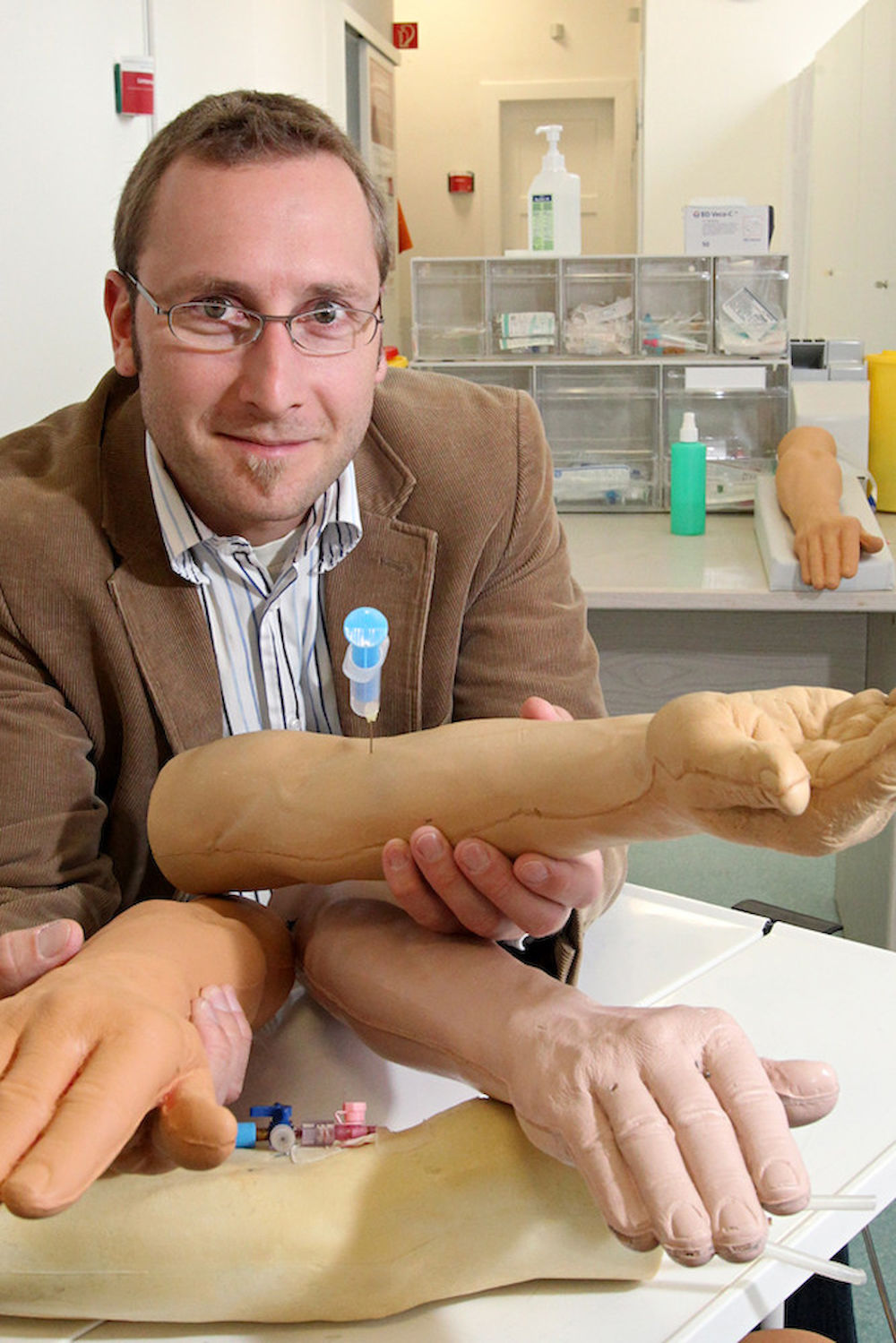 So dramatisch wie im Fall von Karl-Ludwig Schober müssen die Umstände freilich nicht zwangsläufig sein. Die Unzufriedenheit mit den bestehenden Zuständen war es indes auch, die Dr. Andreas Fichtner anspornte. Am Anfang seiner Arbeit stand die Frage: Wie können alle Medizinstudenten unter gleichen Bedingungen das Blutabnehmen lernen? Man schrieb das Jahr 2008 und der Anästhesist baute an der Uni Dresden gerade das Skillslab auf, eine Einrichtung zur Ausbildung von Medizinstudenten.