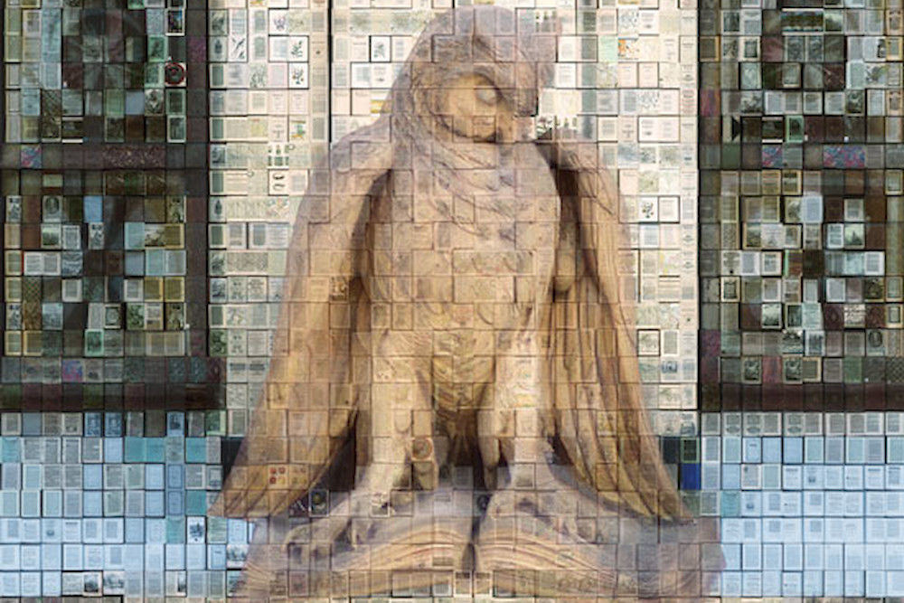 „Das Plakat soll eine positive Zwischenbilanz symbolisieren. Es setzt sich aus über 2.500 gescannten und komprimierten TIFF-Seiten aus den verschiedenen Projekten der Bibliothek zusammen“, erläutert Dorothea Sommer die Idee. „Diese Seiten liegen verkleinert als Kacheln hinter dem vergrößerten Foto der Eule. Damit entsteht ein Kontrast, der dem Plakat Spannung und gleichzeitig Tiefe in der Darstellung im Detail verleiht.“
