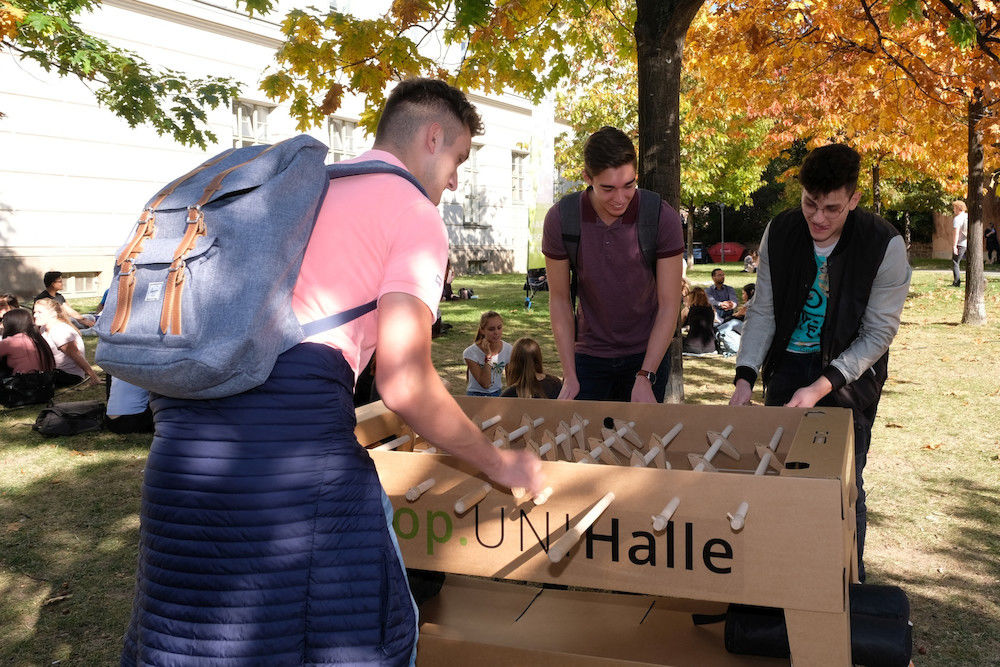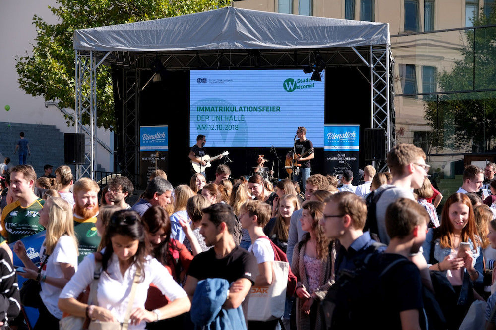 Die neuen Studierenden konnten sich seit 10 Uhr an zahlreichen Beratungsständen informieren. Auf reges Interesse stieß zum Beispiel der Stand des Universitätssportzentrums, wo sich die Studentinnen und Studenten über das komplette Sportprogramm und das Prozedere der Buchung informierten. Nebenan beim Studentenwerk waren Bafög und Wohnen in Halle dominierende Themen. Begleitet wurde die Immatrikulationsfeier durch ein Bühnenprogramm mit Live-Musik und ein Gewinnspiel. Auch sportlich konnten sich die Erstis bei sommerlichem Wetter schon austoben - am Volleyballnetz des Universitätssportvereins.