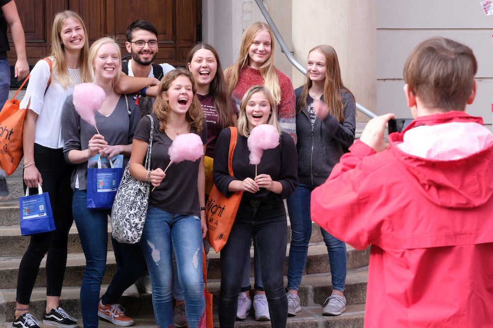 Zu den Höhepunkten der Feier zählte der von Journalist Gerald Perschke und Lars Wohlfarth moderierte "Students-Welcome-Talk" in der Aula, der erstmals auch live als Video in die sozialen Medien der Uni übertragen wurde. Auf dem Podium saßen neben dem Rektor auch die "Professorin des Jahres 2017" Prof. Dr. Heike Kielstein von der Medizinischen Fakultät, der neu berufene Geodynamik-Experte Prof. Dr. Michael Stipp und Student und Wasserspringer Florian Fandler. In der Runde vor den Erstis in der gut gefüllten Aula ging es auch um "erste" Erfahrungen - ob um den ersten Schnitt an einem Menschen, den Anatomie-Professorin Kielstein 1989 setzte, oder den ersten Sprung vom Fünf-Meter-Turm bei Fandler. Stichwort Turmsprung: Gefragt, was sie gern mit einem der anderen Gäste in Halle unternehmen würden, entschied sich Tietje für Turmspringen mit Fandler und Sportschülern. Stipp, lange Zeit in einem Schwimmverein, schloss sich an, während Kielstein gern dem Rektor die Meckelschen Sammlungen zeigen würde.