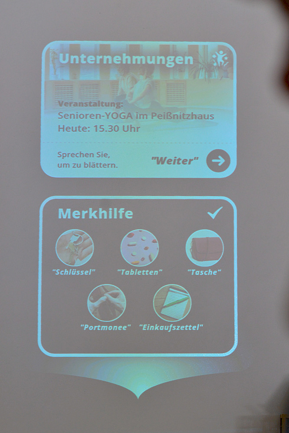 Die Bedürfnisse und Erwartungen der Zielgruppe sind für das Projekt von besonderer Bedeutung. „Seniorinnen und Senioren fühlen sich von Technik oft bevormundet“, sagt Böhmer. Darauf wird in den virtuellen Hinweisen nicht nur bei der Formulierung Rücksicht genommen – anders als in der Technik oft üblich wird zum Beispiel nicht geduzt. Und: „Es soll auch nicht nur ein ‚Achtung, Sie machen etwas falsch!‘ sein“, sagt Mahn. Auf Anweisungen wird verzichtet, vor allem aber wird mit den Einblendungen immer auch ein zusätzlicher Service verbunden. Über dem Herd erscheint also nicht nur die Information, welche Platte noch heiß ist. Es werden auch Kochrezepte eingeblendet, per Sprachbefehl können die Nutzerinnen und Nutzer dann wie in einem Buch umblättern. An der Wohnungstür stehen über den Merkhilfen für Schlüssel und Co. zum Beispiel Veranstaltungstipps wie der Termin für das heutige Senioren-Yoga.