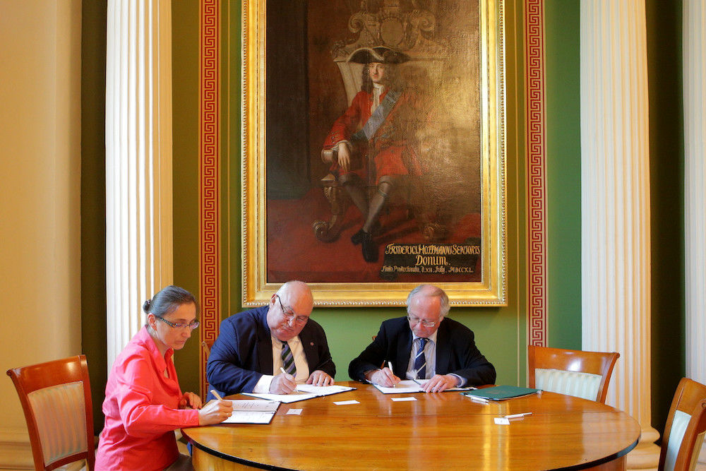 Gemeinsam freuten sich beide darüber, dass ihre Hochschulen durch einen Kooperationsvertrag verbunden sind. Dieser wurde in der Aula feierlich unterzeichnet, genau wie jener, der die Zusammenarbeit mit der Uraler Staatlichen Juristischen Universität in Russland regelt. Deren Präsident, Prof. Dr. Viktor Perevalov, brachte in seinem Grußwort anlässlich der Unterzeichnung nicht nur seine große Freude über diesen Vertrag zum Ausdruck. Zugleich zeichnete er ein lebhaftes Bild der bisherigen Zusammenarbeit der Wissenschaftler seiner Hochschule mit der Universität Halle und äußerte Vorschläge für künftige Projekte. „Ich hoffe auf eine fruchtbare Zusammenarbeit“, sagte Perevalov. Beide Uni-Partnerschaften sind nicht neu: Seit vielen Jahren besteht eine enge Kooperation der beiden Hochschulen mit der Uni Halle.