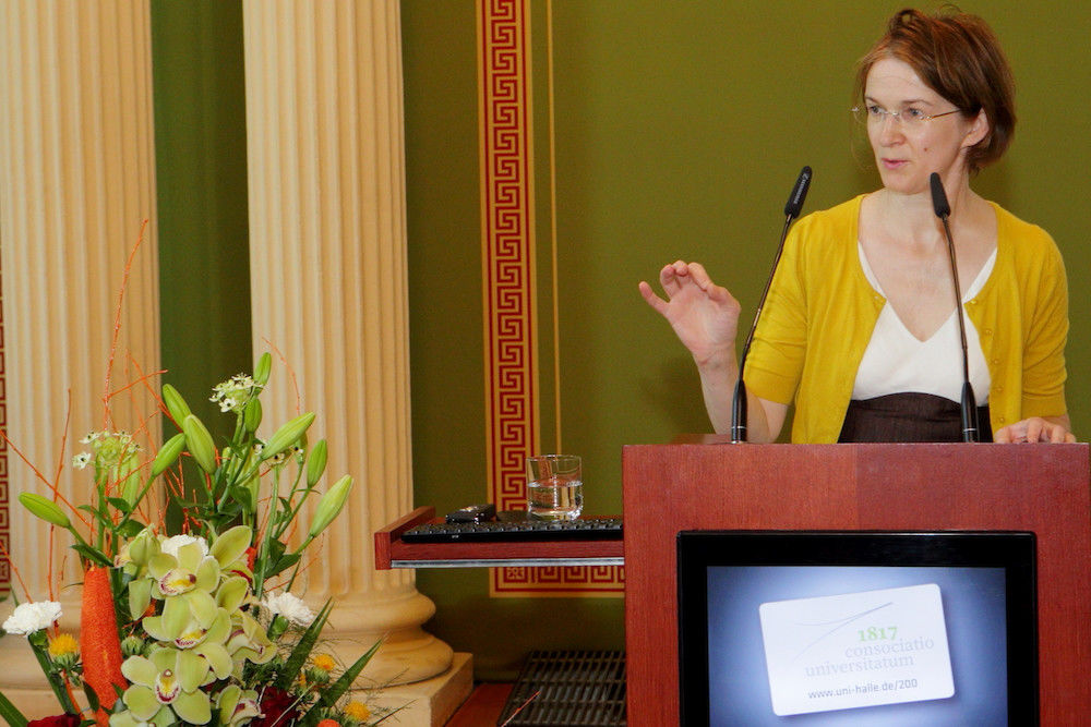 Wie gut der internationale Gedanke an der Uni Halle inzwischen auch im Bereich der hoch dotierten Forschung gegriffen hat, zeigt das Beispiel der französischen Germanistin, Prof. Dr. Elisabeth Décultot. Als Inhaberin einer Humboldt-Professur ist sie in den Genuss der höchsten Auszeichnung gekommen, die Deutschland an ausländische Forscher zu vergeben hat. Und sie hat sich für ihre Arbeit das Zentrum für die Erforschung der europäischen Aufklärung (IZEA) an der Martin-Luther-Universität ausgesucht. Warum, das erklärte sie in ihrem Vortrag unter dem Titel „Crossing borders. How a French literary scholar from Paris came to be in Halle“ eindrucksvoll. Darin wurde auch deutlich: Der Schritt der Französin von Paris nach Halle war kein Zufall sondern eine bewusste Entscheidung, „weil mir die Uni Halle optimale Bedingungen für meine Forschungsthemen bot“, so Décultot.