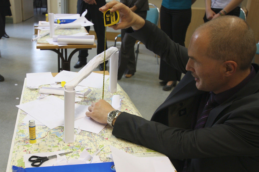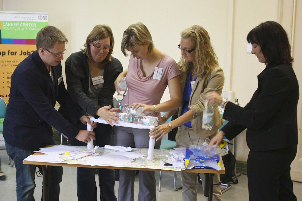 Präsentieren, konstruieren, diskutieren, in Rollen schlüpfen und kooperieren: In fünf Übungen wurden die sozialen Kompetenzen der Teilnehmenden etwa beim gemeinsamen Bau einer mit Wasserflaschen belastbaren Papierbrücke oder in einer „Jeder gegen jeden“-Diskussionsrunde auf Herz und Nieren geprüft.