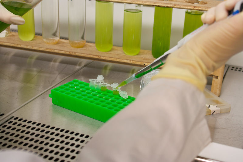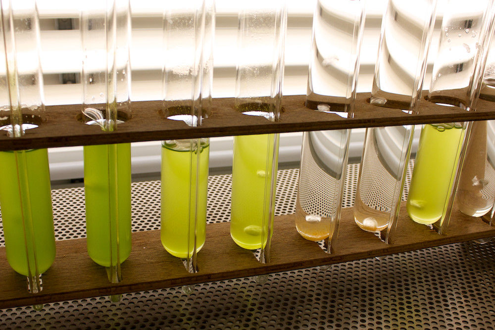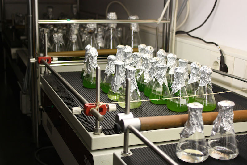 Etliche Monate lang haben sie daher in einzelnen Versuchsreihen im Labor drei Algenarten – zwei aus Australien und eine alpine Schneealge – und eine weitere Alge als Referenzstamm sowohl in Petrischalen als auch in großen Kolben in einer Kniese-Apparatur zum einen verschiedenen Mengen des Farbstoffs Bengalrosa, zum anderen verschieden langer und intensiver UV-Bestrahlung ausgesetzt.