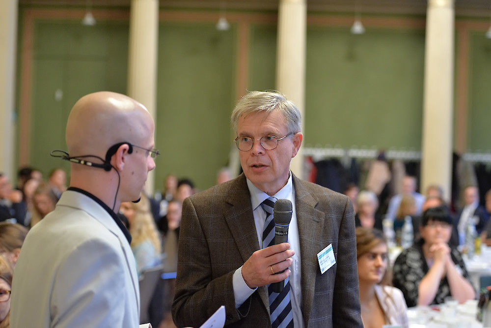 „Was bewegt jemanden dazu, Stipendien für Studierende zu stiften?“, will Hüttner, der Sprechwissenschaft studiert, von den anwesenden Förderern aus der Wirtschaft, aus öffentlichen und gemeinnützigen Einrichtungen sowie von den privaten Stipendiengebern wissen. Gründe gibt es viele: Die enge, oft langjährige Beziehung zur Uni Halle wird genannt. Aber auch das Sparen an der Bildung, wie es die Landesregierung derzeit anstrebe. Das habe ihn dazu bewogen als Privatperson in Bildung zu investieren, erzählt Dr. Frank Dreihaupt, Präsident der Zahnärztekammer Sachsen-Anhalt.