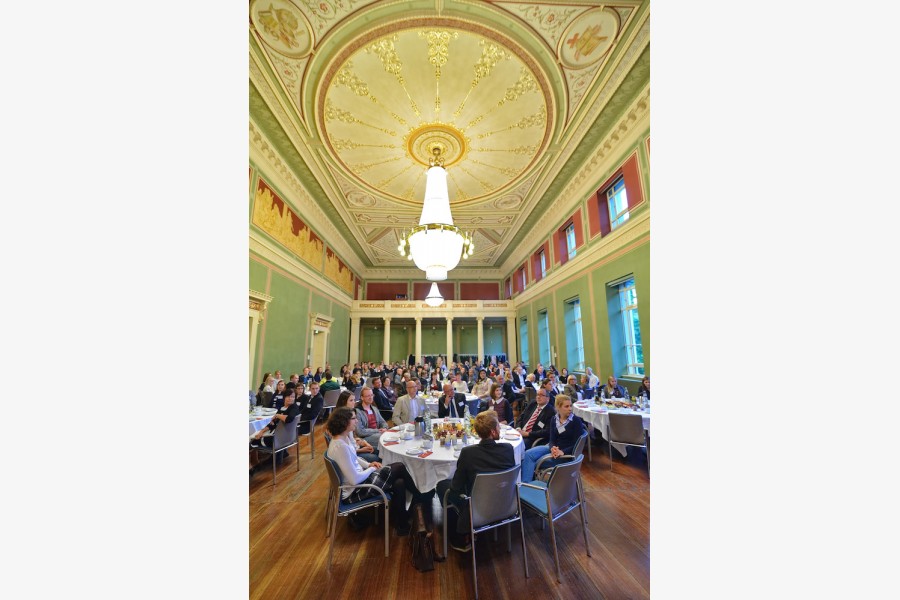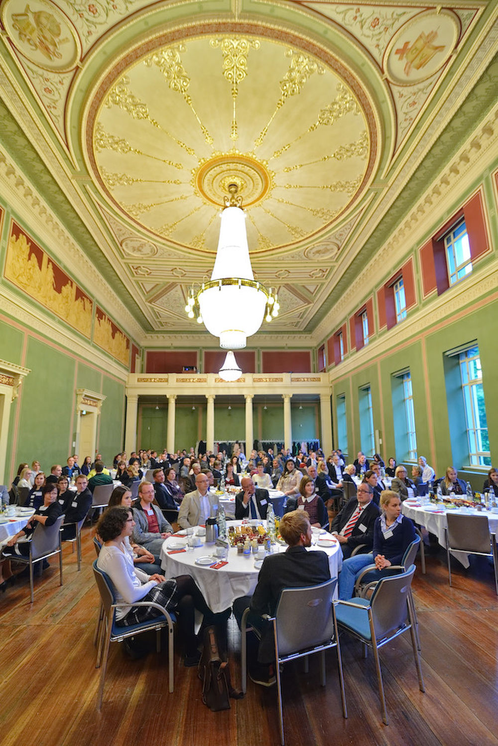 Die Aula bietet ein ungewohntes Bild: 15 runde Tische mit Kaffeegedeck sind Indiz dafür, dass heute weder Vortrag noch Podiumsdiskussion auf dem Programm stehen. Stattdessen haben 140 Stipendiaten, Förderer und Uni-Vertreter Gelegenheit, sich in lockerem Rahmen auszutauschen – dank Moderator André Hüttner auch über Tische hinweg.