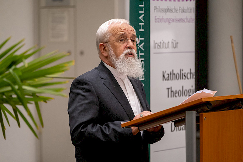 Prof. Dr. Harald Schwillus gab zunächst einen launigen Überblick über die Geschichte des Instituts. Gegründet im Wintersemester 2003/04 ausgerechnet an der Martin-Luther-Universität Halle-Wittenberg, inmitten der Diaspora – mit dem Ziel, Lehrerinnen und Lehrer für das Fach Katholische Religion in Sachsen-Anhalt auszubilden. Die Grundlage: eine Vereinbarung zwischen dem Land Sachsen-Anhalt und dem Bistum Magdeburg.