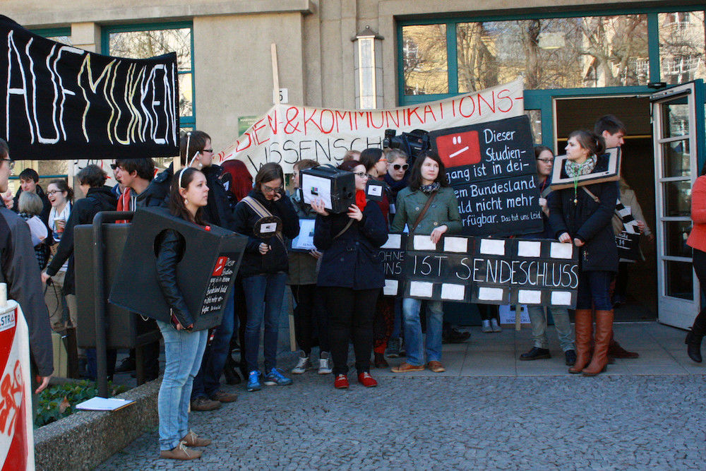 Mit Plakaten, Trillerpfeifen und Trommeln hatten Studierende und Dozenten der Medien- und Kommunikationswissenschaften (MUK) bereits vor Beginn der Senatssitzung um 14 Uhr deutlich Präsenz gezeigt, denn sie fürchteten um die Zukunft ihres Departments. Der Vorschlag, den das Rektorat in die Sondersitzung im Rahmen der festzusetzenden Zulassungszahlen im örtlichen Vergabeverfahren eingebracht hatte, lautete: Im Wintersemester 2014/15 und Sommersemester 2015 die Immatrikulation in die Bachelor- und Masterprogramme auf Null zu setzen.