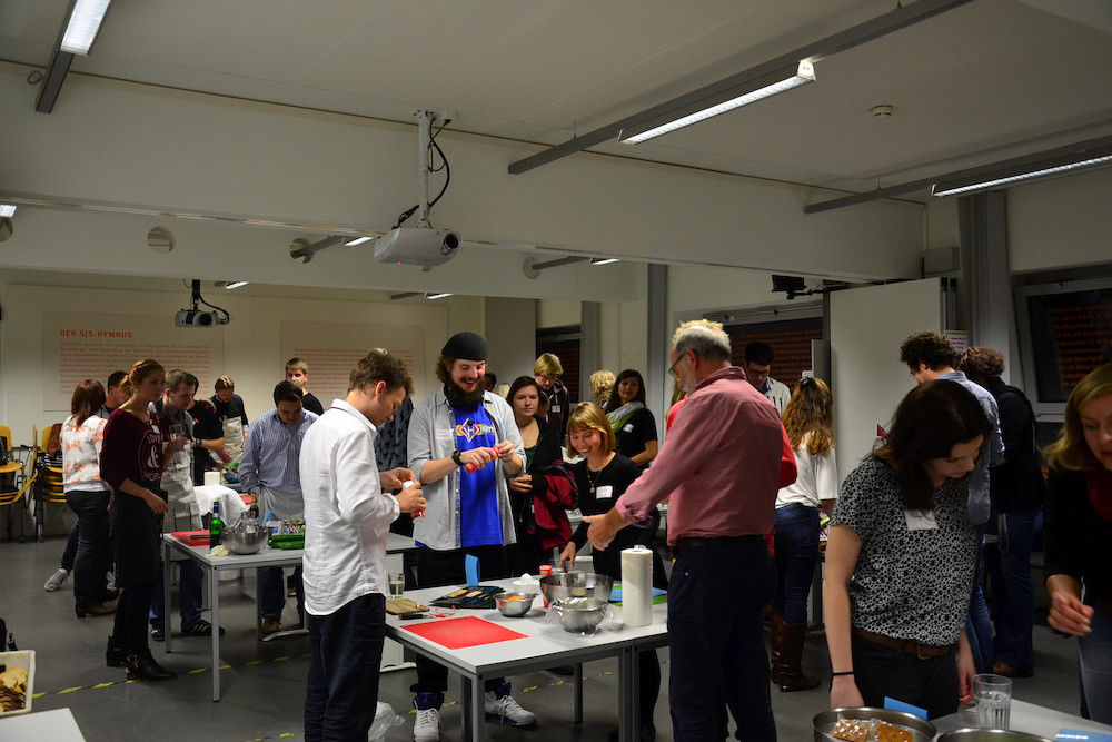 Der Geruch von Basilikum und gerösteten Pinienkernen wabert durch die Flure, angereichert mit lautem Stimmenwirrwarr. Folgt man der Quelle, so tut sich ein großer Hörsaal auf, in dem dicht an dicht Vertreter ansässiger Medienunternehmen und MLU-Studierende stehen und kochen. Darunter unter anderem Stephanie Scholz. Sie sei in einer Doppelfunktion hier, erzählt sie, während sie einen Tofu-Papaya-Spieß in Chili-Limetten-Öl-Dressing tunkt. Einerseits als Studierende, andererseits als Vertreterin von Radio Corax. Die heutige Veranstaltung komme ihr wie gerufen, „um unser Radio mehr in die Wahrnehmung der Teilnehmer zu bringen.“