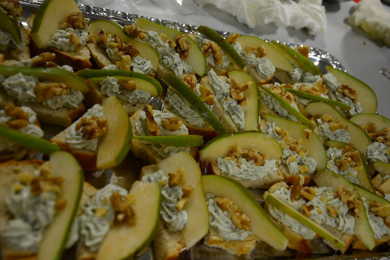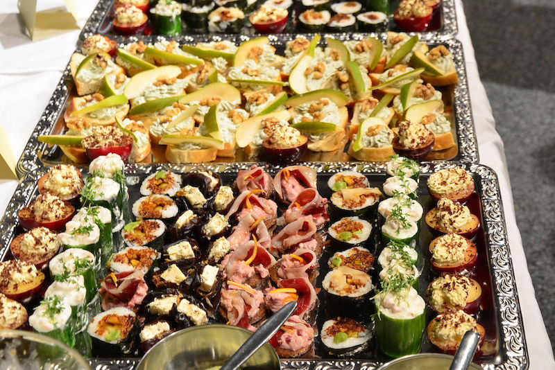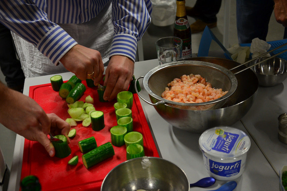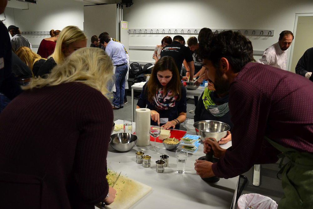 Jeder der insgesamt zehn Tische, so das Konzept, versucht sich an einem anderen Gericht. Canapé mit Roquefort-Créme steht da auf dem Programm, Caprese-Spieße mit Pesto oder Sushi mit Gurke und Räucherforelle. Snacks, die nicht nur deliziös klingen, sondern trotz einfacher Zubereitung auch so schmecken, entstammen die zugehörigen Rezepte doch der Feder eines professionellen Leipziger Kochs.