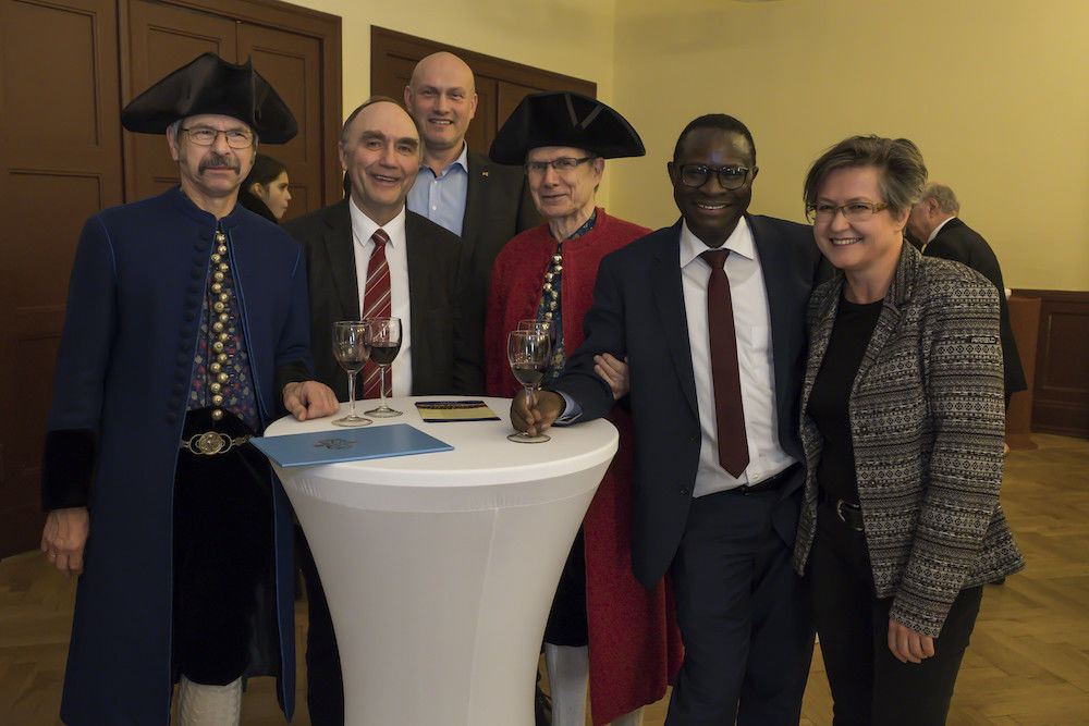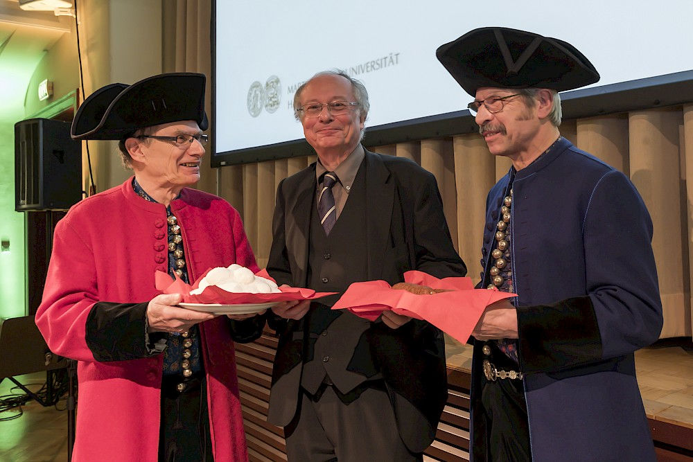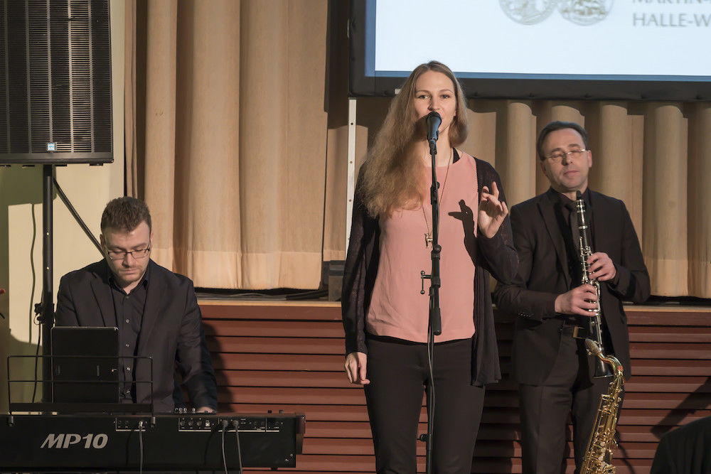 Anschließend überreichten die Halloren, Mitglieder der Salzwirkerbrüderschaft, ihr traditionelles Neujahrsgeschenk, bestehend aus Schlackwurst und Soleier. Mit Blick auf das 25-jährige Jubiläum des Weinberg Campus 2018 sprach Prof. Dr. Reinhard Neubert über die Geschichte und Forschung des Standortes und Dr. Ralf-Torsten Speler, Präsident der Vereinigung der Freunde und Förderer der Universität (VFF), ließ das vergangene Jahr im Zeichen des 100-jährigen Geburtstags der VFF Revue passieren. Musikalisch umrahmt wurde das Programm durch das Jazztrio vom Institut für Musik unter Leitung von Martin Tuchscherer.