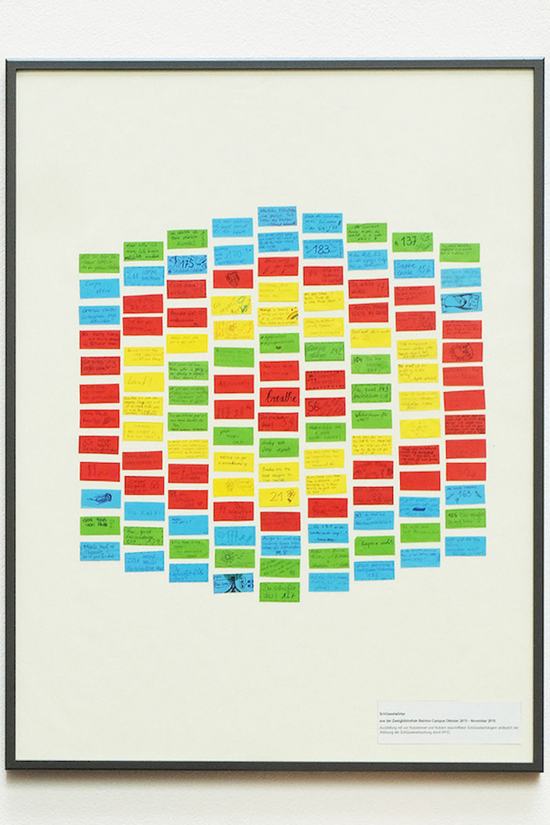 Durch die Umrüstung der Schließfächer mit RFID-Schlössern, bei denen der Benutzerausweis als Schlüssel dient, wurden die Schlüssel mitsamt der bunt gestalteten Anhänger überflüssig. Zum Wegwerfen natürlich viel zu schade, können alle beschrifteten Zettel nun eingerahmt im Erdgeschoss der Zweigbibliothek am Steintor-Campus bewundert werden – und wahrscheinlich so manchem Besucher bei näherer Betrachtung ein Lächeln abgewinnen.