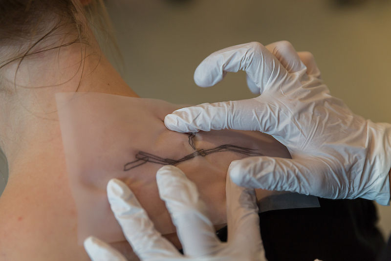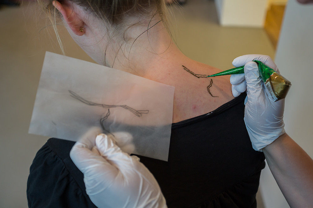 Die Vielfalt der künstlerischen Zugänge ist vielfältig. „Diese Vielfalt ist ein Zeichen, dass es ein wirklich kreativer Prozess war, der alle Freiheiten bot“, sagt Peter Wycisk. Diese Freiheit machte sich auch Tattoo-Künstlerin Annekathrin Pohle zu nutze. Eigentlich ist sie Schmuckkünstlerin, entwickelt aber zusammen mit den Ausstellungsbesuchern ganz individuelle Tattoos am Computer aus dem geologischen Untergrundmodellen heraus. Im Anschluss überträgt die Künstlerin die Grafik mit Henna-Farbe auf die Haut des Besuchers