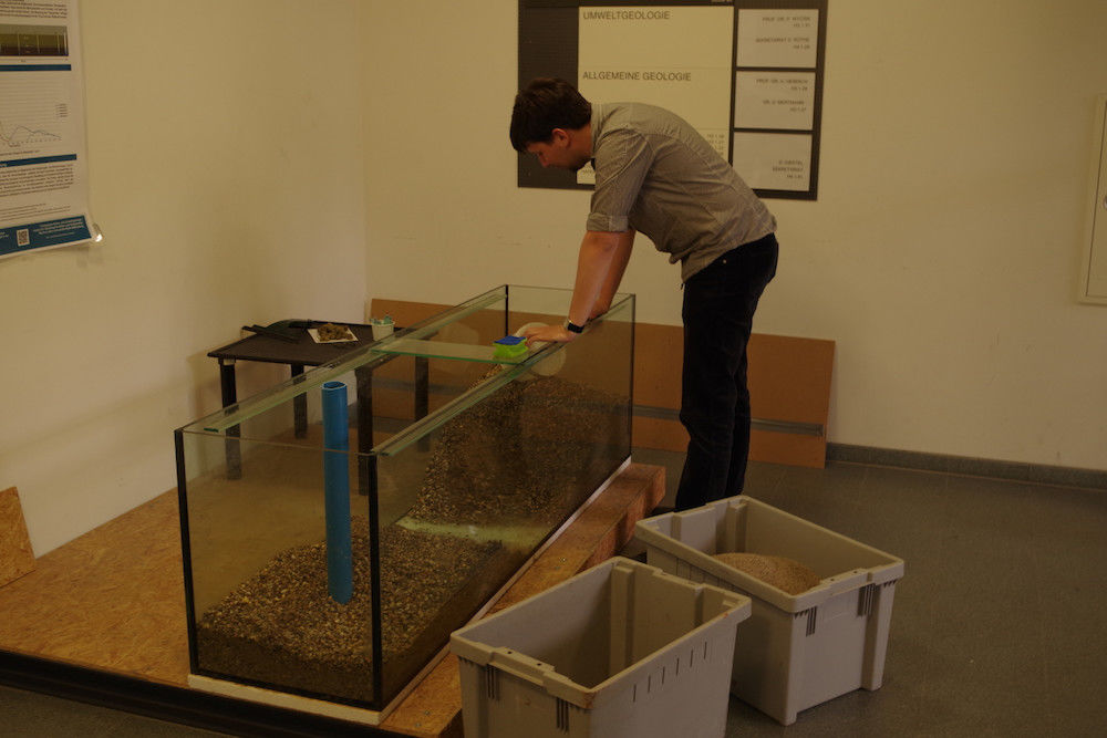 Wenige Tage vor der Langen Nacht bringt Doktorand Lars Schimpf das zwei Meter lange Anschauungsmodell nochmal auf Vordermann: Gemeinsam mit Student René Zahl kippt er neue Schichten Kies in den Glaskasten und prüft die selbstgebaute Pumpensteuerung. An dem Modell können die Hydrogeologen im kleinen Maßstab demonstrieren, wie sich Grund- und Oberflächenwasser in unterschiedlichen Szenarien verhalten. „Wir können zum Beispiel Hochwasser simulieren und zeigen, wie sich eine Hochwasserwelle auf die Umgebung auswirkt“, erklärt Schimpf, der zum fünften Mal bei der Langen Nacht dabei ist.