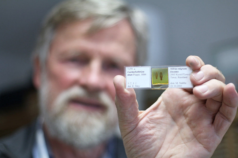 „Mein Interesse für die Tierläuse begann schon in der Jugend, als mir bei Vogelberingungsaktionen diese Insekten auffielen“, sagt Mey. Als Forstingenieurstudent lernte er 1975 auf einem Symposium seinen späteren Mentor Prof. Dr. Wolfdietrich Eichler kennen und war fortan den Geheimnissen der Mallophagen auf der Spur. An der Universität Halle absolvierte er ein Fernstudium der Biologie und forschte an der hiesigen Mallophagensammlung. Deren Grundstein legte der erste ordentlich berufene Zoologie-Professor der Uni Halle Christian Ludwig Nitzsch, der ab 1800 Tierläuse sammelte, beschrieb und den Gruppennamen „Mallophagen“ kreierte. Diese Leidenschaft teilt Eberhard Mey, der rund 10.000 Exemplare aus aller Welt zusammengetragen hat. Die beachtliche Sammlung befand sich am Naturhistorischen Museum Rudolstadt in Thüringen, wo Mey 34 Jahre lang Kustos war. Inzwischen ist er im Ruhestand und die „Rudolstädter Sammlung“ ist als Dauerleihgabe ans ZNS in Halle umgezogen. „Die Idee dafür hatte der Leiter des ZNS Dr. Frank Steinheimer, der mich vor etwa drei Jahren fragte, ob man meine Sammlung an das ZNS verleihen könnte“, sagt er.