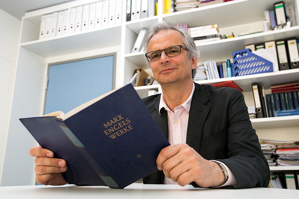 Nur ein Buch von Karl Marx und Friedrich Engels findet sich im Büro von Prof. Dr. Harald Bluhm. Ein Widerspruch? Schließlich begleitet er seit 2008 die Marx-Engels-Gesamtausgabe, ein umfangreiches Editionsprojekt, an dessen Ende mehr als 110 Bände stehen werden. „Ein Großteil der MEGA ist digital im Netz verfügbar, andere Bände stehen in meinem Berliner Büro“, erklärt der Professor für Politische Theorie und Ideengeschichte an der Uni Halle. Als Projektleiter der MEGA und Forscher, der selbst über den Klassenbegriff von Marx promoviert wurde, ist er in diesen Tagen viel unterwegs. „Marx beeinflusst auch heute noch das Denken vieler Menschen“, sagt Bluhm. Besonders seit den Finanzkrisen der 2000er Jahre erlebten seine Theorien und Werke wieder einen Hype.