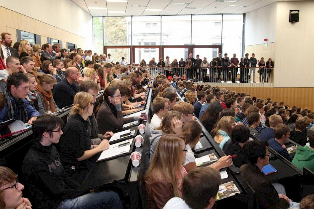 Schon als Moderatorin Sissy Metzschke zum Mikrofon griff und „The big boss“ ankündigte, klangen die ersten Lacher durch den größten aller Unihörsäle, der bis auf den letzten Treppenplatz besetzt war. Nun warteten die neuen Studenten gespannt auf die Worte des Mannes mit der großen Kette: Rektor Udo Sträter witzelte sogleich: „The big boss – ich hoffe, das haben alle meine Kollegen im Senat gehört.“ Stolz begrüßte er die Erstsemester, plauderte von Studentenritualen längst vergangener Zeiten und machte Mut für die kommenden Jahre an der Uni.