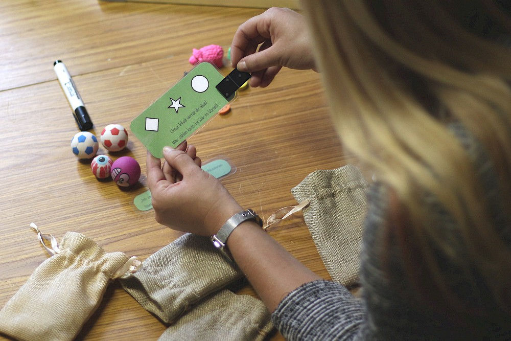 Er passt in eine der Türen des großen Wandschranks, wo das nächste Rätsel wartet: verpackt in drei kleine Stoffsäckchen. Sarah öffnet eines nach dem anderen und heraus kommen Gummibälle, kleine Gummitiere und Dominosteine. Dazu ein kleiner laminierter Zettel mit Symbolen darauf. Nachdenklich dreht sie einen Gummi-Pinguin in der Hand hin und her und überlegt, was ihr die Gummigegenstände verraten könnten. Sebastian gibt ihr einen Tipp: „Wenn du an Cantors Mengenlehre denkst und dir die Figuren anschaust, solltest du auf die Lösung kommen.“