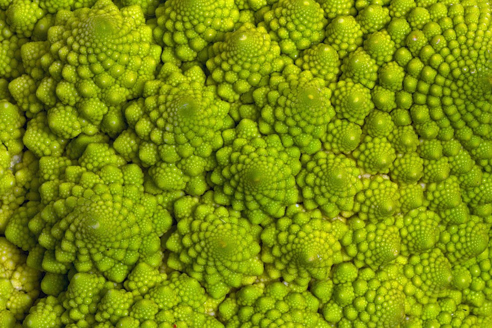 Die kleinen grünen Spitzen des Romanesco-Kohls sind in perfekten kleinen Hügeln und eleganten Spiralen angeordnet. An dem mathematisch interessanten Gemüse werden gleich zwei Phänomene sichtbar. Zum einen hat Romanesco eine sogenannte fraktale Form - jeder kleine Hügel hat die gleiche Form wie der gesamte Kohl. Zum anderen sind seine Spiralen nach Zahlen der Fibonacci-Folge angeordnet.