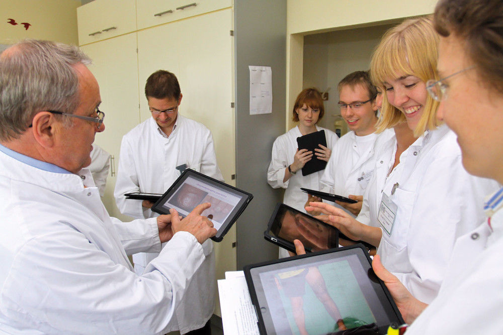 So vermittelt er seit einem halben Jahr mit Hilfe von tragbaren Kleincomputern Lerninhalte direkt am Patienten. „Die Idee entstand bei einer Visite und durch die Anregung meines Kollegen Professor Dr. Johannes Wohlrab“, erklärt Marsch. Kurz danach wurden zehn Apple iPads für einen Stückpreis von 500 Euro angeschafft und seitdem in der Lehre eingesetzt.