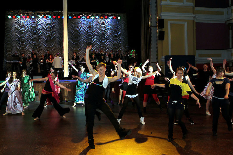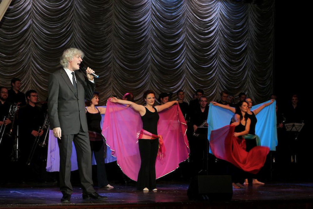 Und auch wer nur lauschen wollte, kam voll und ganz auf seine Kosten: Als Uni Big Band und Happy Swing Band sorgten die Musiker um Hartmut Reszel gemeinsam mit den drei Sängerinnen Karen Gensow, Julia Preußler und Sarina Meier, Studentinnen und Absolventinnen des Instituts für Musik der MLU, etwa als Andrew Sisters, und mit dem Sänger Tommy A. als verblüffend authentischem John Miles zum großen Finale für besondere Klangerlebnisse.