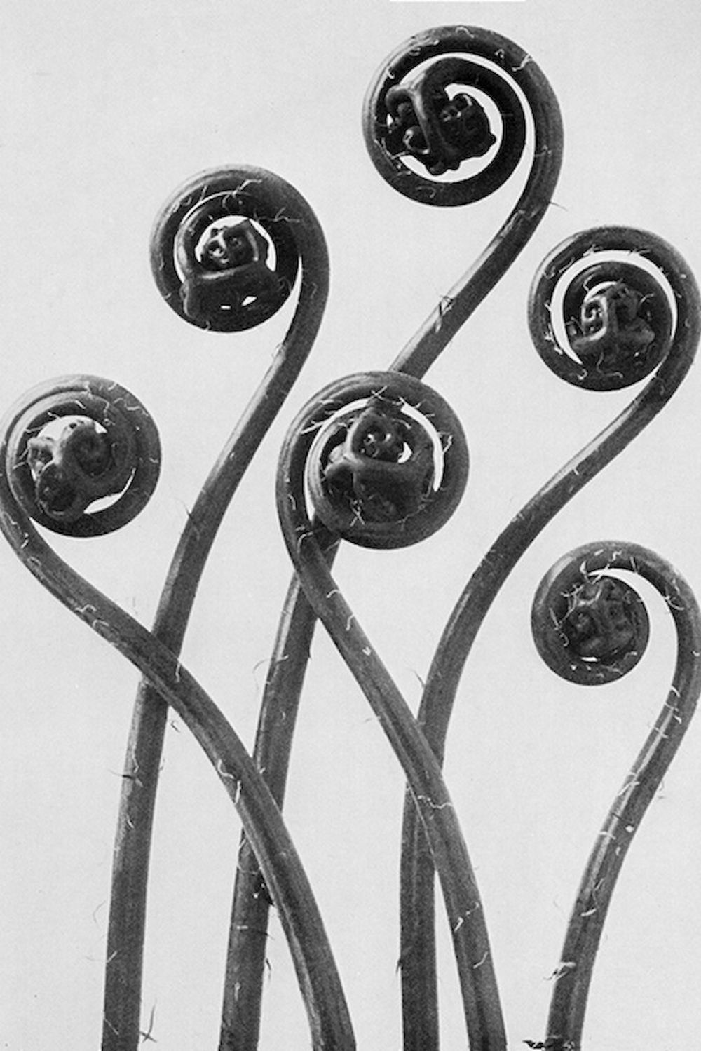 Blossfeldts Fotografien erinnern eher an abstrakte Strukturen und Muster aus der Architektur, als an Pflanzen. Als einer der ersten vergrößerte er Anfang des 20. Jahrhunderts seine Aufnahmen von Farn, Springkraut oder Schachtelhalm um das 12- bis 45-Fache und beeindruckte mit seinen Bildern Botaniker wie Künstler gleichermaßen. „Blossfeldt hat nicht bloß Pflanzen fotografiert, er war auf der Suche nach so etwas wie der Urform der Natur“, erklärt Annika Simm, die die Ausstellung gemeinsam mit dem Kustos des Gartens Dr. Matthias Hoffmann auf die Beine gestellt hat.