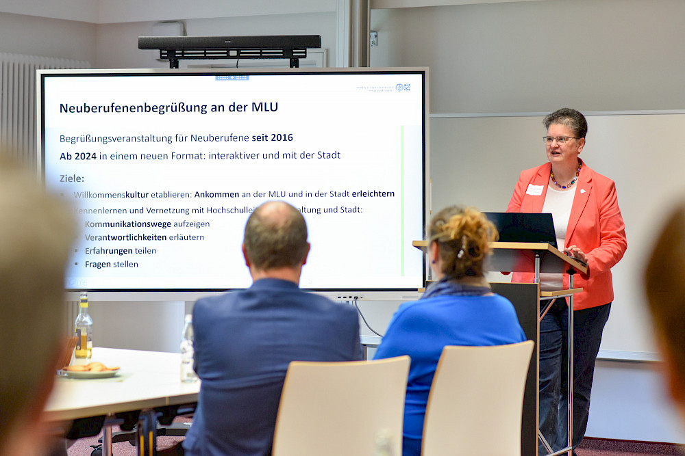 Die im vergangenen Jahr neu konzipierte Neuberufenen-Begrüßung soll das Ankommen in Halle erleichtern. Sie zeige auch die sehr enge Verbindung der Universität zur Stadt und den Austausch zwischen beiden, sagte Rektorin Prof. Dr. Claudia Becker zur Begrüßung im Georg-Forster-Haus. Becker stellte den überwiegend innerhalb der vergangenen zwölf Monate berufenen Wissenschaftlerinnen und Wissenschaftlern nicht nur die im Hochschulentwicklungsplan festgeschriebenen Profillinien der Universität vor. Sie verwies auch auf die Tradition der MLU - und ganz besonders deren Rolle für die Zukunft, zum Beispiel in der Frage, wie die Universität die Stadt Halle als lebenswerte Stadt mit ausgestalten kann. Becker verwies unter anderem auf das Zukunftszentrum für Deutsche Einheit und Europäische Transformation und den Beitrag, den die MLU dazu leisten kann. „Wir wollen zwar traditionsbewusst, aber zukunftsorientiert und damit auch modern aufgestellt sein“, so Becker. Und: „Sie sind diejenigen, die dazu beitragen.“