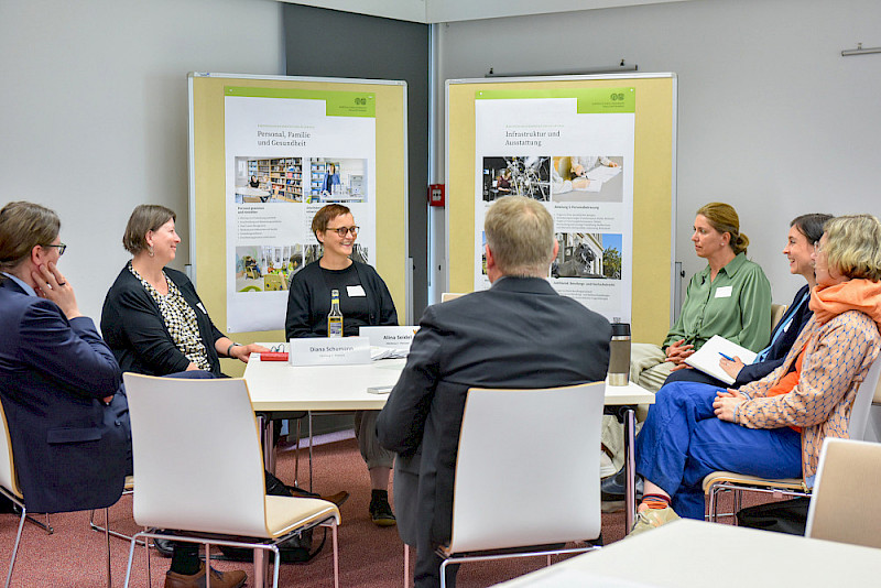 Becker verwies auch darauf, dass die Neuberufenen-Begrüßung die Chance bietet, über die Fakultätsgrenzen hinweg Kontakte zu knüpfen. Jeweils eine Minute lang stellten sich dafür nicht nur die Mitglieder des Rektorats, sondern auch die Wissenschaftlerinnen und Wissenschaftler vor – eine Grundlage für die sich anschließenden Gespräche. „Ich habe hier schon ein paar Anknüpfungspunkte gesehen“, sagte die Rektorin. An drei Thementischen konnten die Neuberufenen anschließend mit Mitarbeiterinnen und Mitarbeitern aus dem wissenschaftsunterstützenden Bereich zu Forschung und Lehre, Personal und Ausstattung sowie Medizin debattieren.
