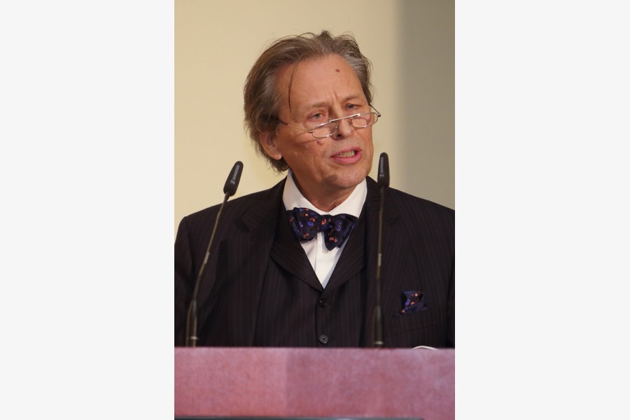 Dann öffnete sich die Bühne für die elf Schauspieler des Studententheaters Halle unter Leitung von Tom Wolter. Eigens für diesen Abend hatten sie, ausgestattet unter anderen mit Cello, Saxophon und einer improvisierten Fantasiesprache, in Anlehungs an Arthur Schnitzlers „Der Reigen“ ein kurzes Stück zum Thema Wünsche entwickelt. Im Anschluss begrüßte Dr. Ralf-Torsten Speler, Präsident der Vereinigung der Freunde und Förderer e.V., die Gäste und überbrachte unter anderem die Grüße seines Vorgängers Dr. Wolfgang Röller und des ehemaligen halleschen Oberbürgermeisters Klaus-Peter Rauen. Zwei Lehramtsstudierende sorgten mit einer Mischung aus aktuellen Songs und bekannten Klassikern für den musikalischen Rahmen.