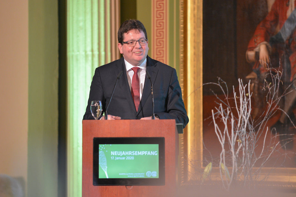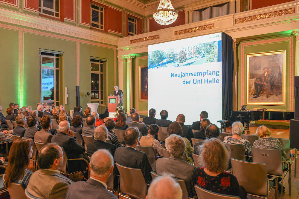 Zur Neujahrsbegrüßung, der 518. der Universität, gehörte freilich auch ein Rückblick auf das vergangene Jahr. Tietje listete dabei eine Reihe von Erfolgen auf: eine weiterhin hohe Zahl an Studierenden, die Internationalisierung der Lehramtsausbildung, ein steigendes Drittmittelaufkommen, die Verlängerung der Förderung für den Sonderforschungsbereich „Polymere unter Zwangsbedingungen“ an der MLU und den Kompetenzcluster für Ernährung und kardiovaskuläre Gesundheit (nutriCARD) der Universitäten Halle, Jena und Leipzig oder die Förderung in den Bundesprogrammen zum Tenure Track und „Exist Potentiale“ waren einige davon. Tietje nannte auch den Erfolg bei der Einwerbung von Fördermitteln im Programm „Kleine Fächer-Wochen“.