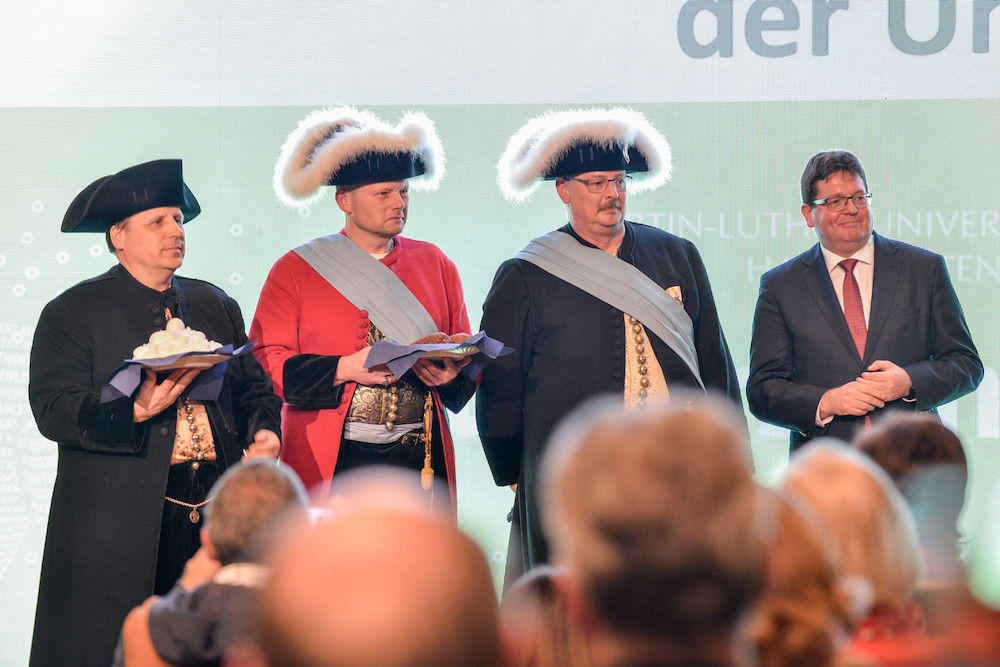 Nach der traditionellen Übergabe der Neujahrsgaben Salz, Soleier und Schlackwurst durch die Halloren der Salzwirker-Brüderschaft im Thale zu Halle wurden die Gäste mit Gesprächsstoff der besonderen Art in den Rest des Abends entlassen. Der Präsident der Vereinigung der Freunde und Förderer der MLU Dr. Ralf-Torsten Speler kündigte eine Erweiterung der Rektorengalerie im Historischen Sessionssaal an. Im April werde das nächste Porträt überreicht, verriet Speler. Welchen Rektor es abbildet und welcher Künstler ihn verewigt hat, das blieb allerdings ein Geheimnis.