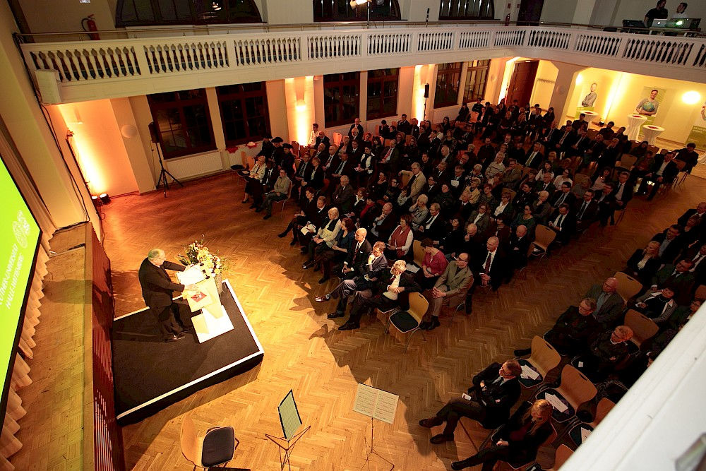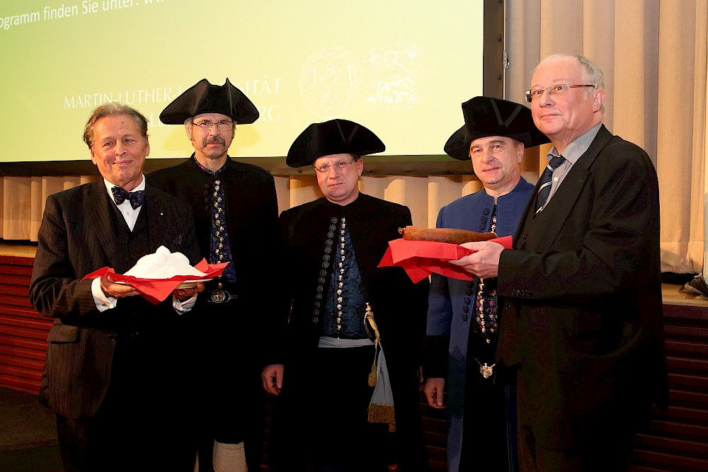 Symbolische Unterstützung erhielt er daraufhin von drei Mitgliedern der Halloren-Salzwirkerbrüderschaft, die ihr traditionelles Neujahrsgeschenk, bestehend aus Schlackwurst und Soleier, zum „Schutz vor dem Bösen“ überreichten. Abschließend sprach Dr. Ralf-Torsten Speler, Präsident der Vereinigung der Freunde und Förderer der Martin-Luther-Universität, über die zahlreichen von der Vereinigung geförderten Projekte an der Universität.